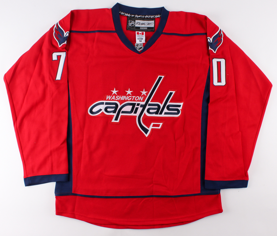 Reebok on-ice style jersey. Everything is sewn on, size 50. Hand-signed in black felt-tip pen by Braden Holtby (Capitals).