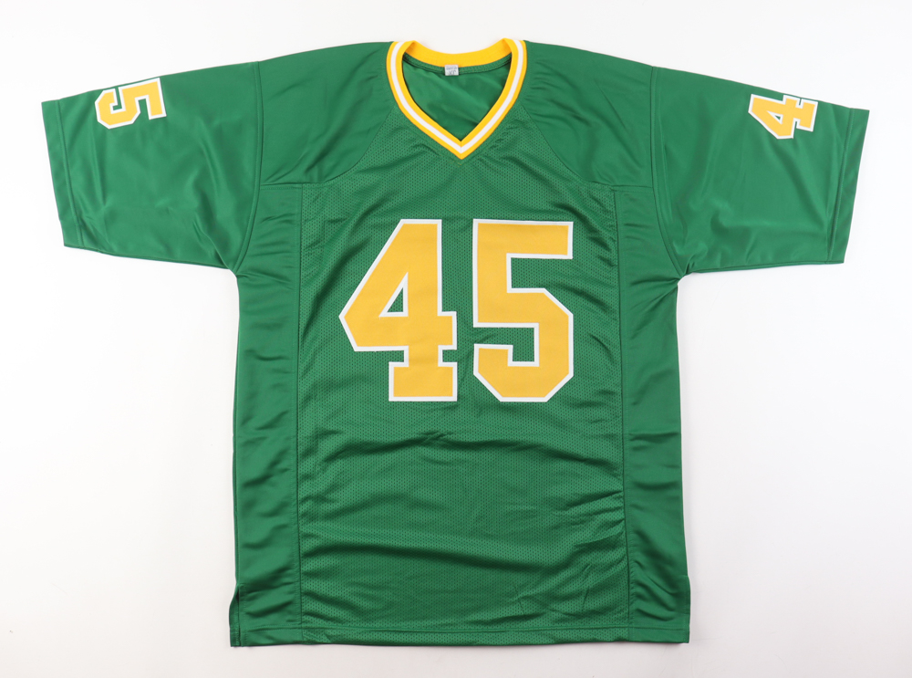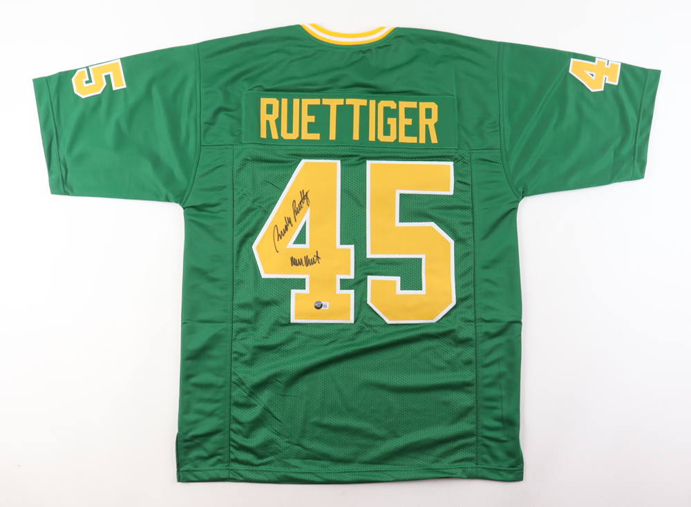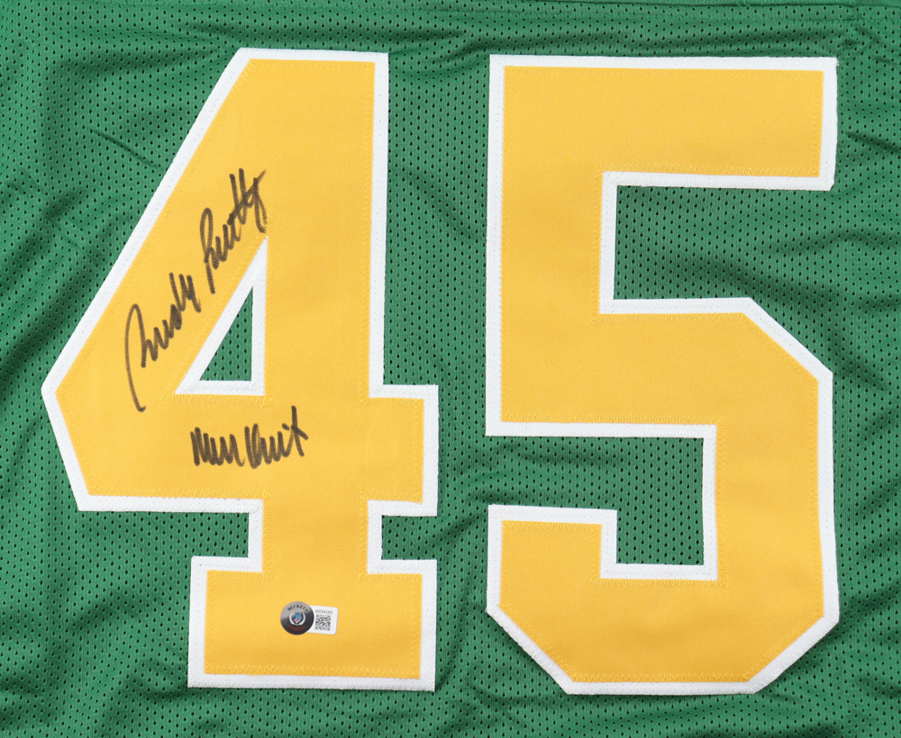 Custom jersey with everything sewn on, size XL. Hand-signed and inscribed by Rudy Ruettiger.