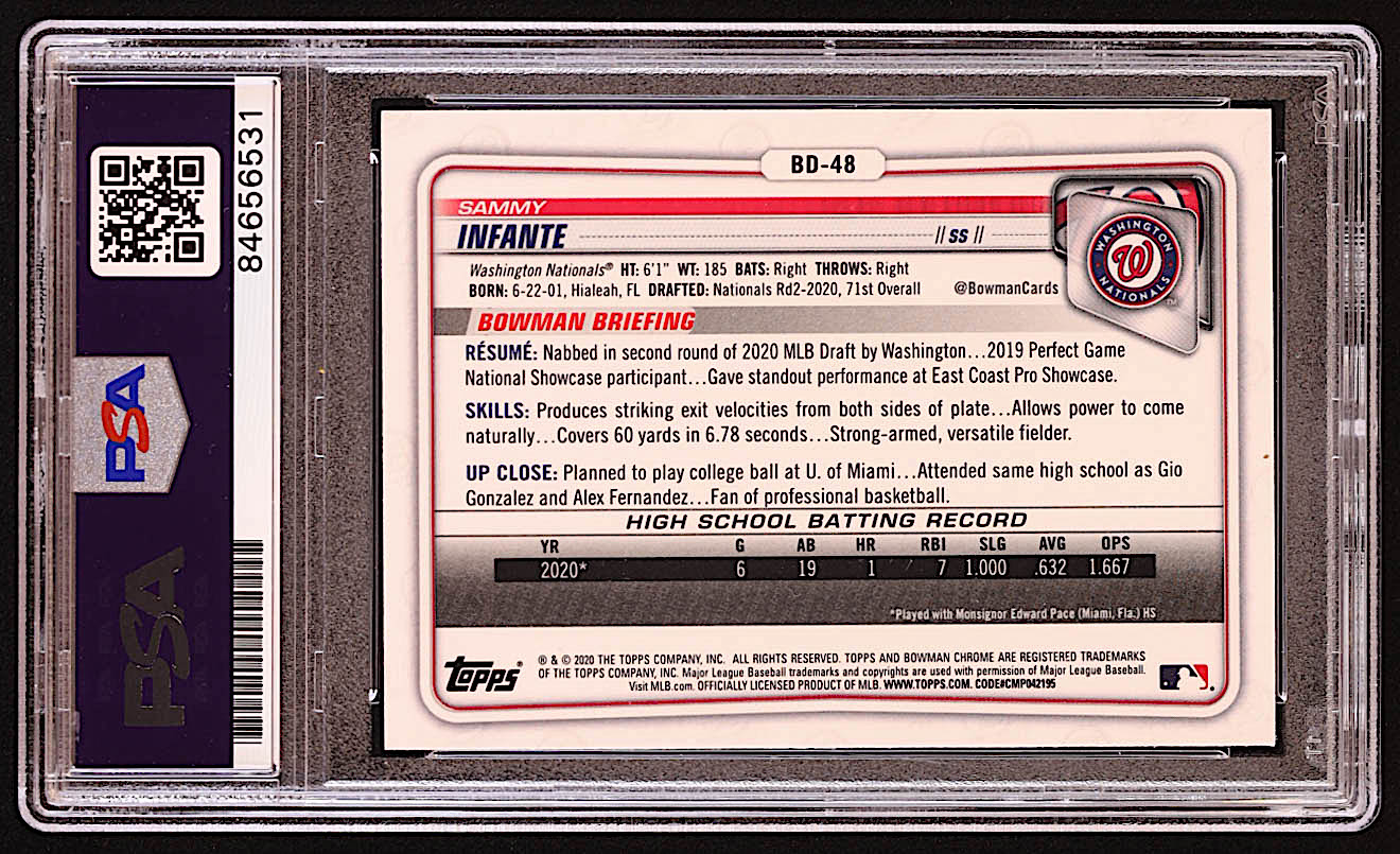 Sammy Infante Signed 2020 Bowman Chrome Draft #BD48 RC (PSA)