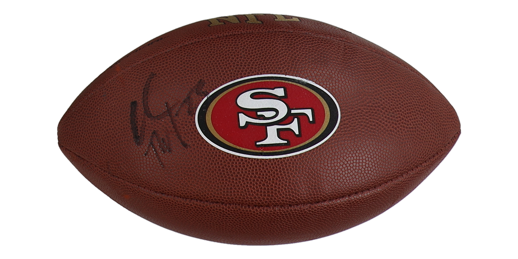 Wilson San Francisco 49ers logo NFL football. Hand-signed by Christian McCaffrey. Please note the ball has small tears and scratches on it.