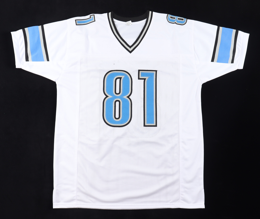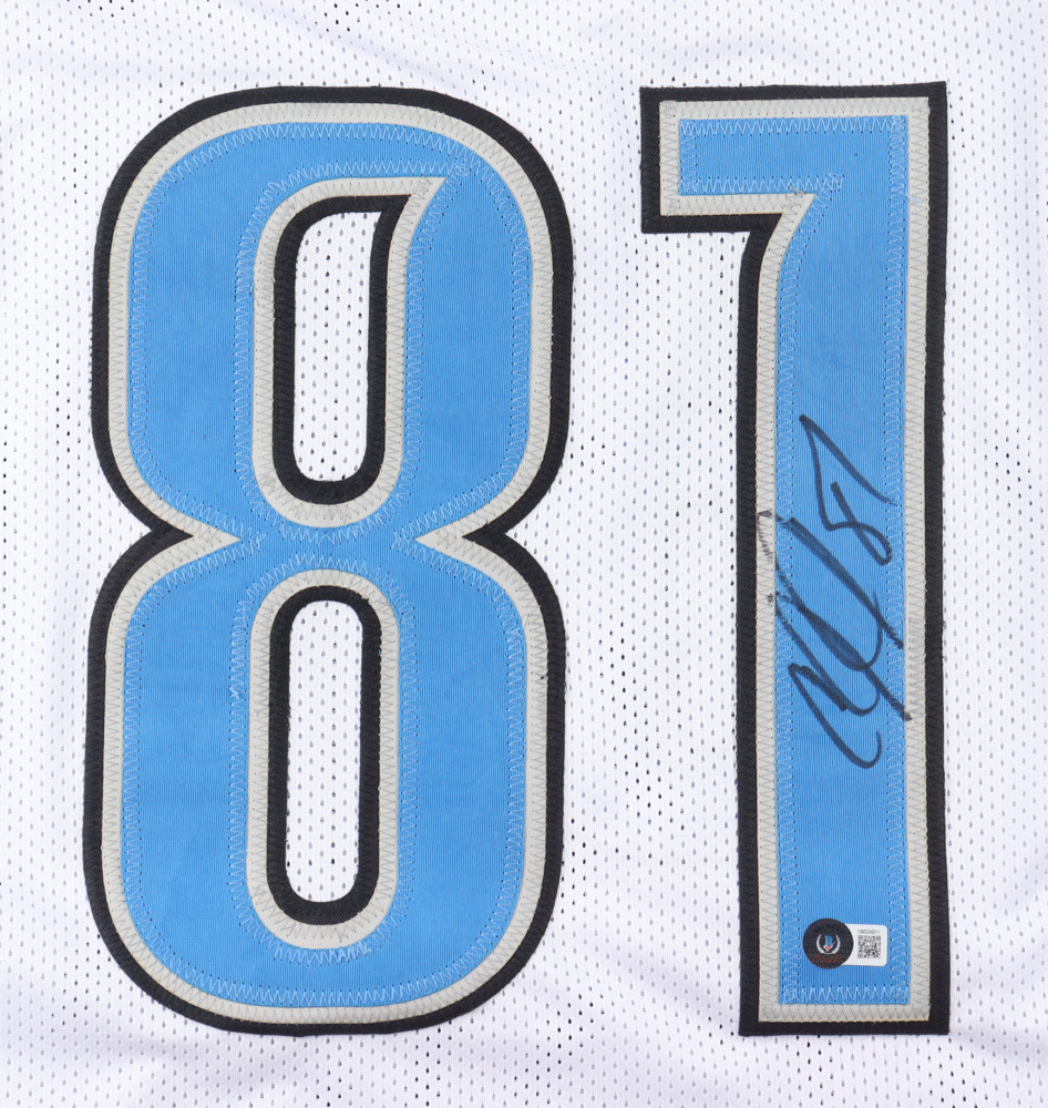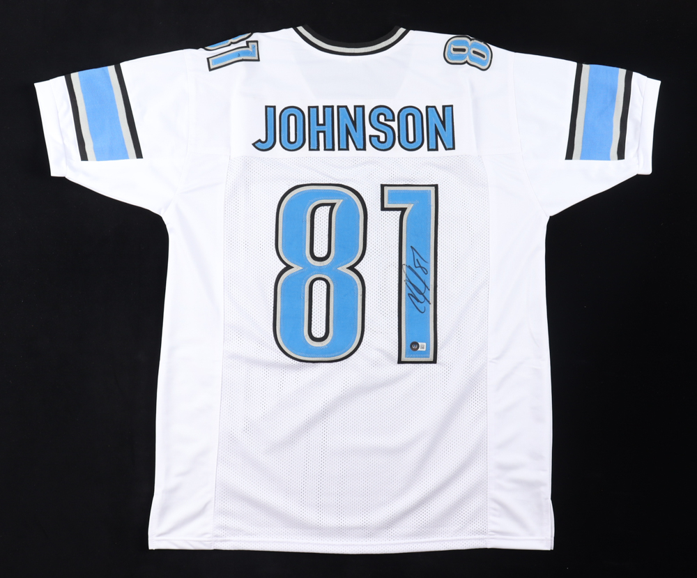 Custom jersey with everything sewn on, size XL. Has been hand-signed by Calvin Johnson.