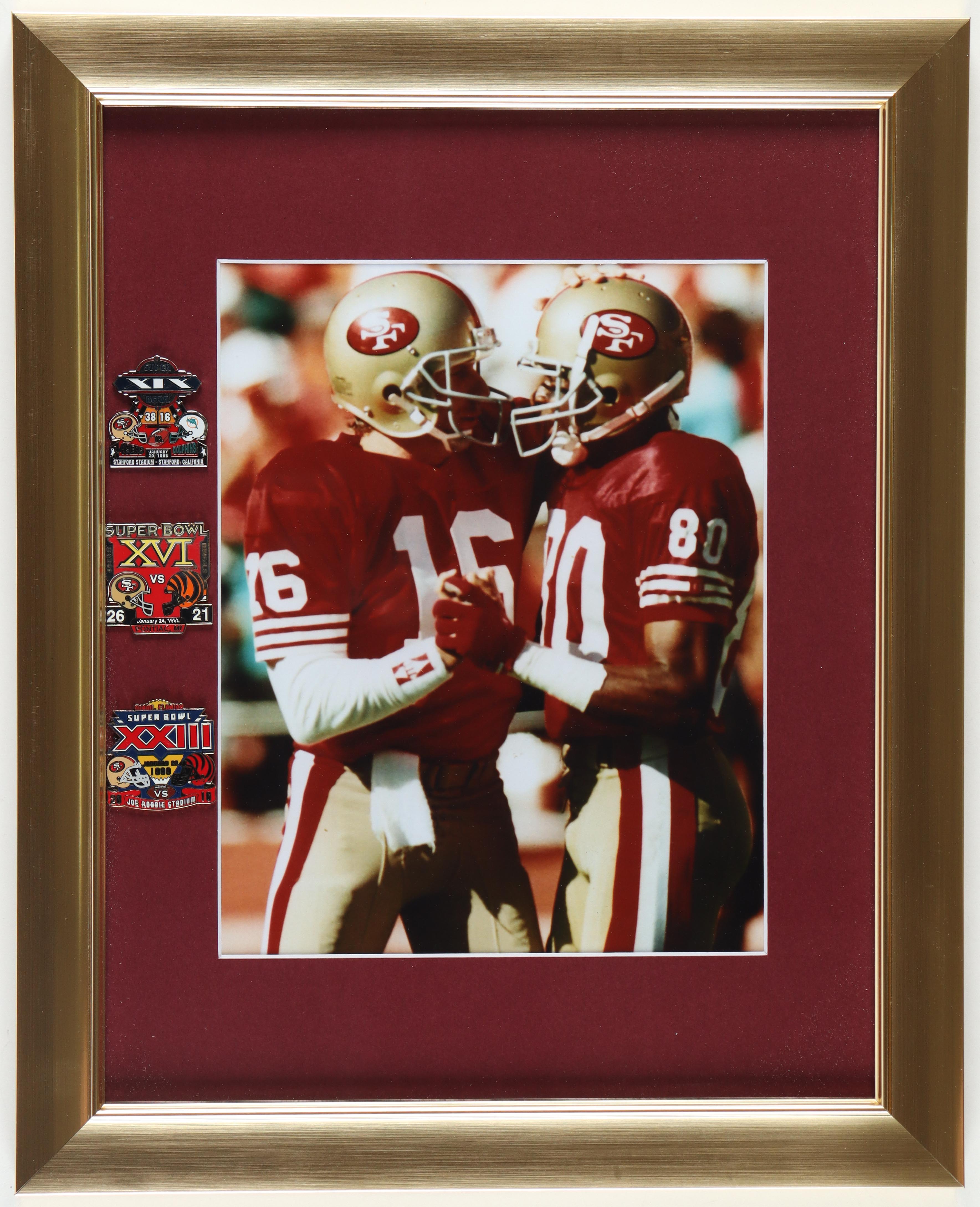 Display measures approximately 13" x 16" in size. Features a photo of Joe Montana (San Francisco 49ers, HOF) & Jerry Rice (San Francisco 49ers, HOF). Includes Super Bowl XIX, XVI & XXIII Pins.
