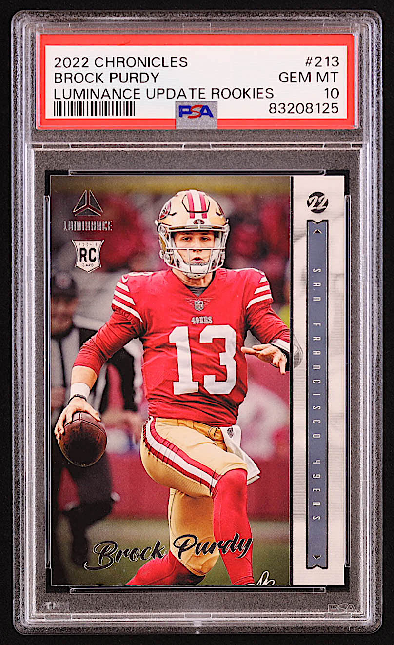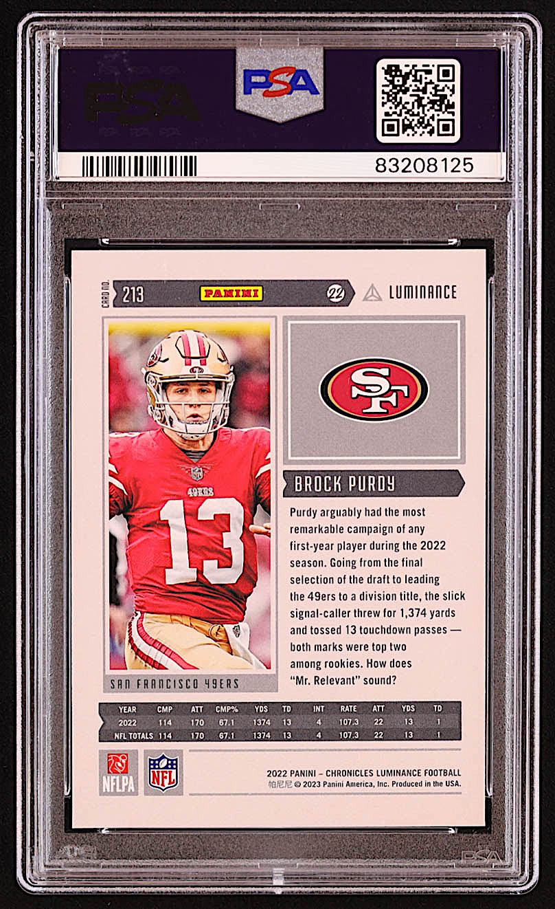 Brock Purdy 2022 Panini Chronicles Luminance Update Vertical Rookies #213 RC (PSA 10)