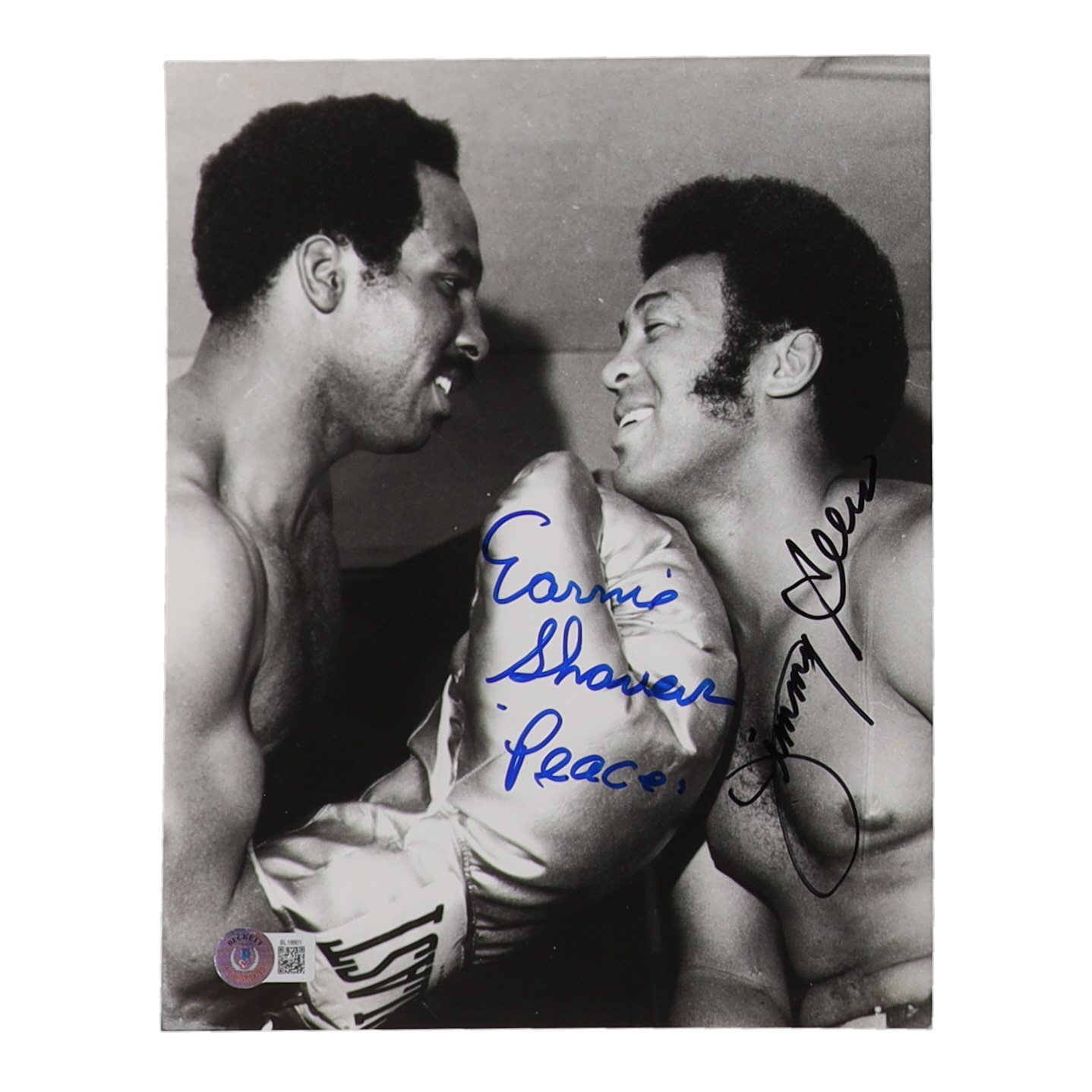 Photo measures 8" x 10" in size and has been hand-signed and inscribed by Earnie Shavers (D. 2022) and Jimmy Ellis (D. 2014).