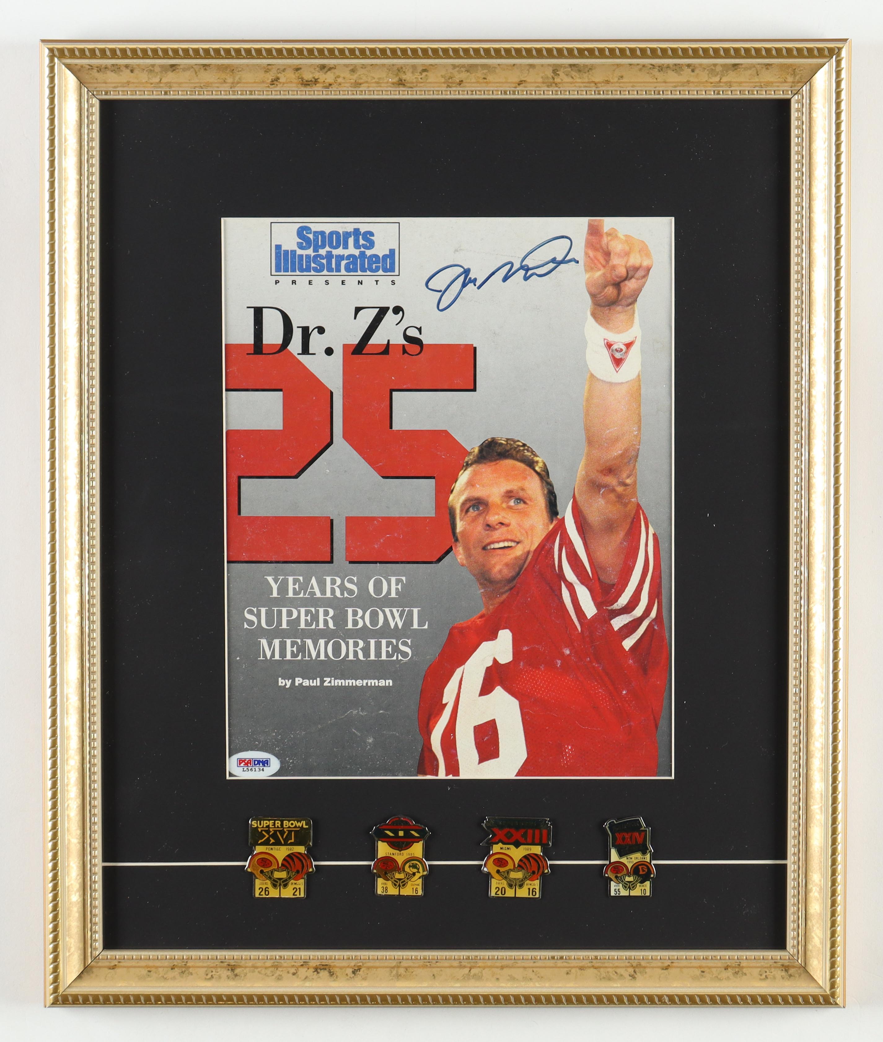 Joe Montana Signed 1991 "Sports Illustrated" Custom Framed Magazine with (4) Super Bowl Champion Pins (PSA)