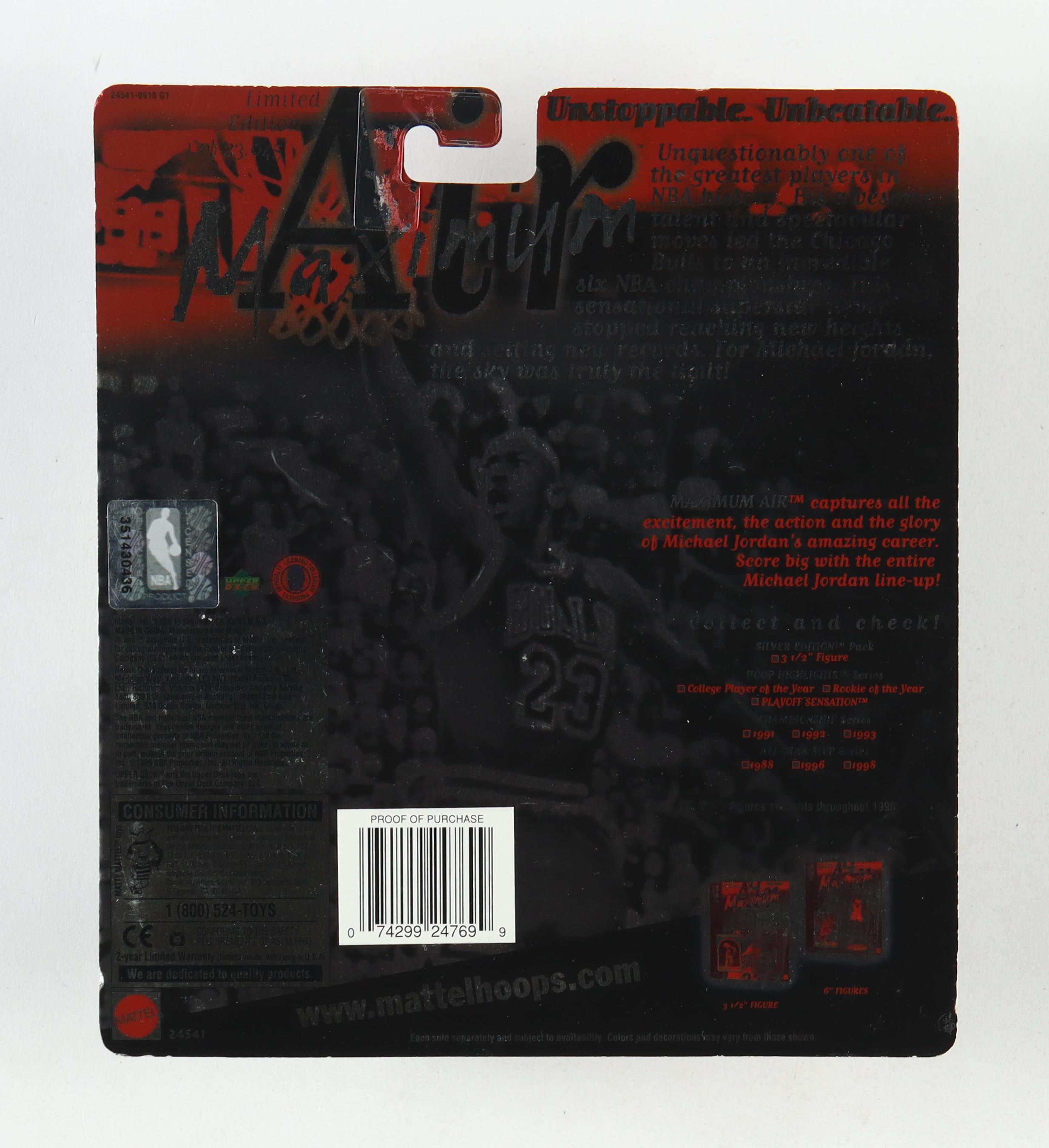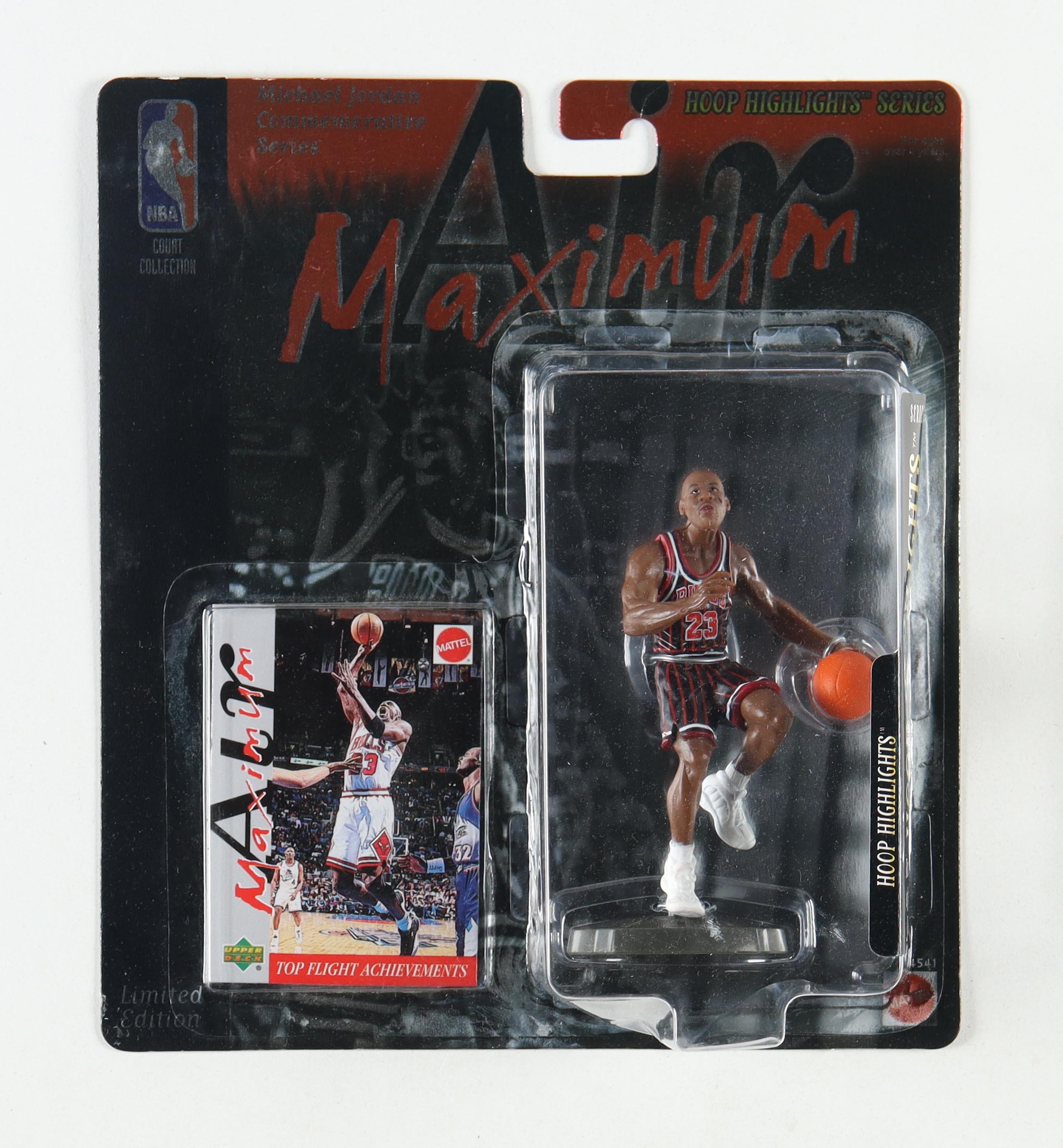 Mattel Michael Jordan Chicago Bulls 1999 Maximum Air Hoop Highlight Series Commemorative action figure measures approximately 6" in height. Action figure includes an Upper Deck basketball card and comes in the original packaging as shown. Figure is limited edition # 1 / 23,045.