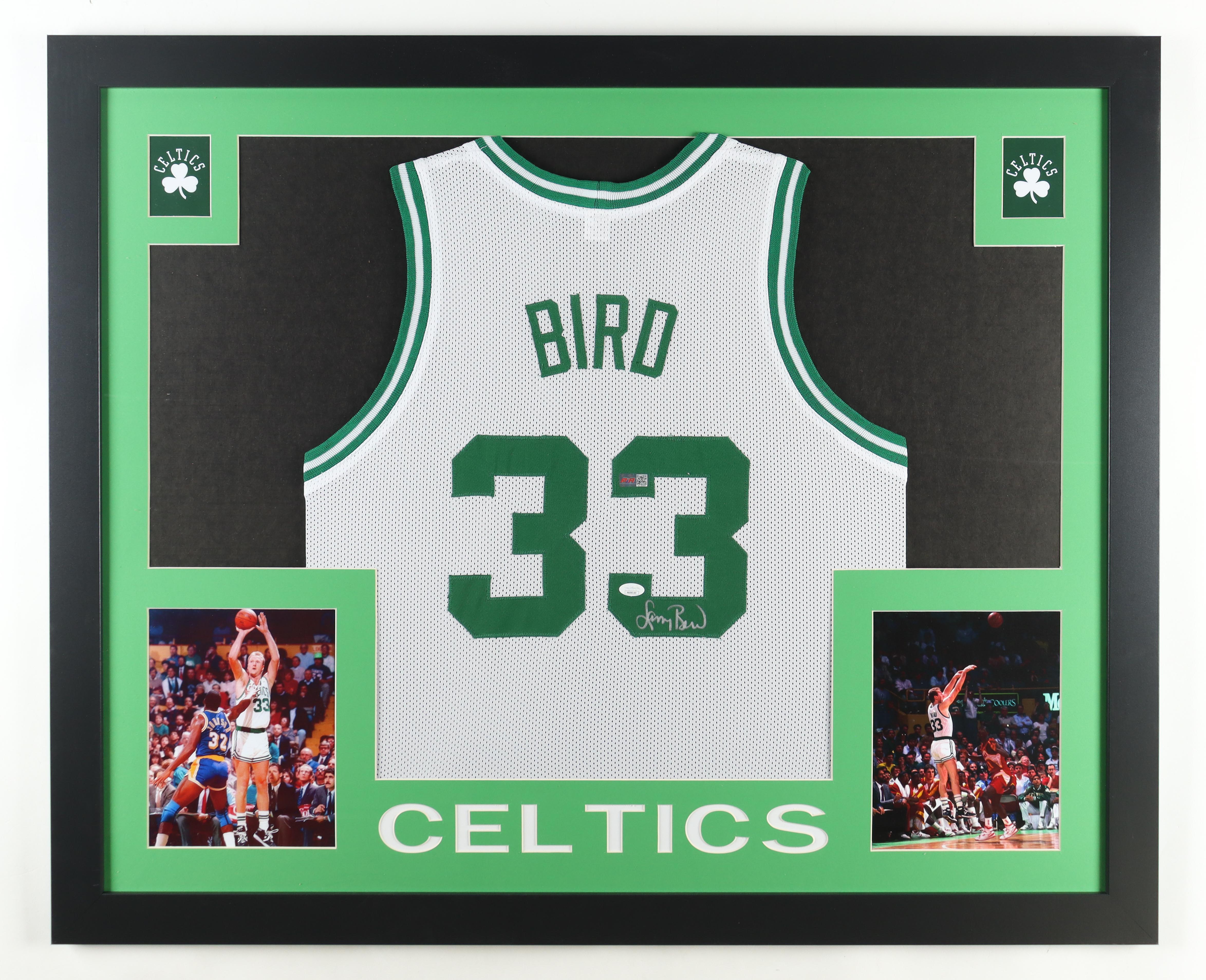 Custom frame measures 35" x 43" in size and features a jersey that has been hand-signed by Larry Bird (HOF). Please note, the 8x10 photos may be swapped.
