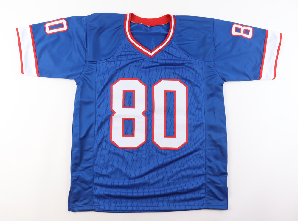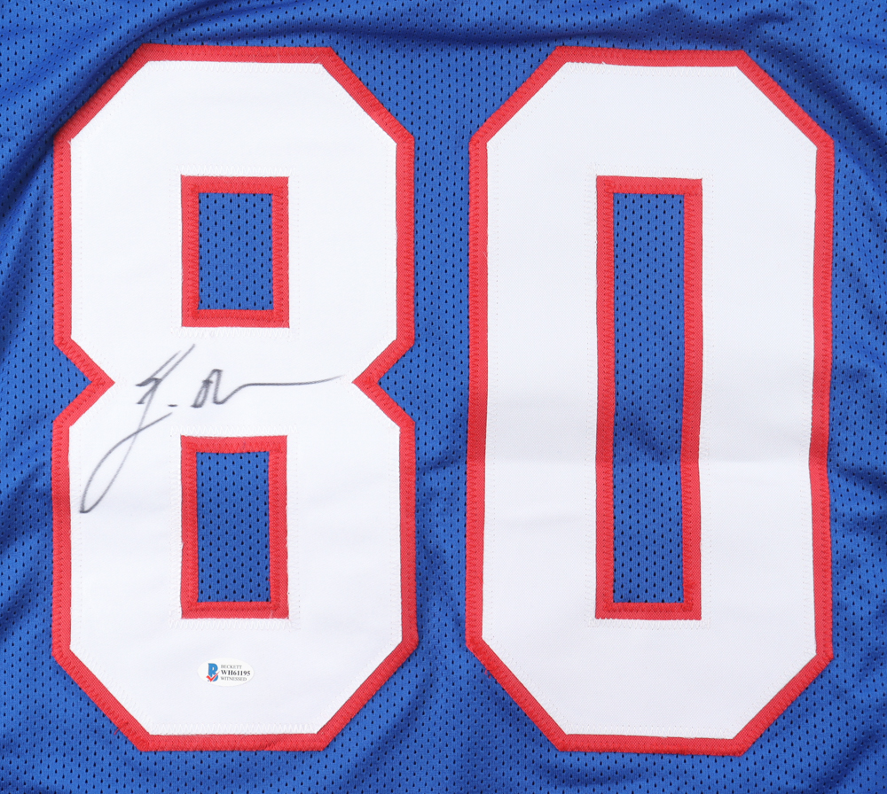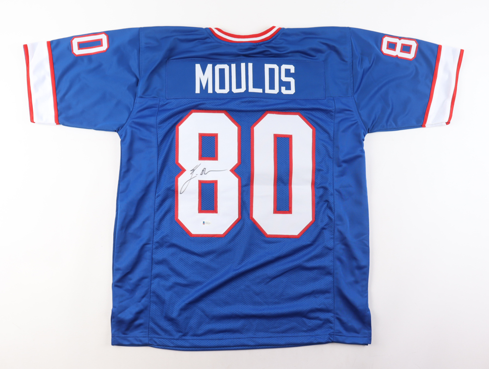 Custom jersey with everything sewn on, size XL. Hand-signed by Eric Moulds. Please note, the signature has bled.