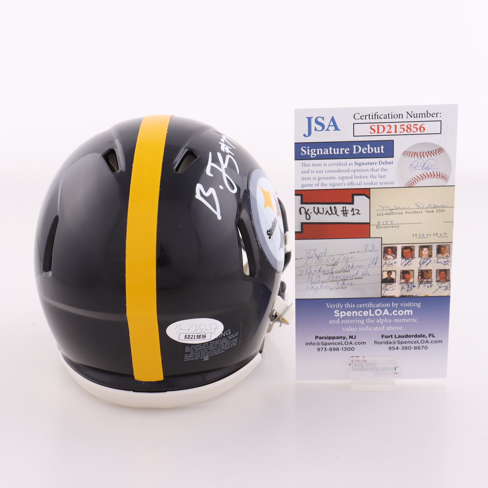 The autograph(s) includes an official James Spence Authentication (JSA) "Signature Debut" hologram and COA. "Signature Debut" is the autographed memorabilia equivalent to a rookie card. The JSA definition of a "Signature Debut" is as follows: "Any item that is autographed and received by JSA prior to the last game of the signer's official rookie season.