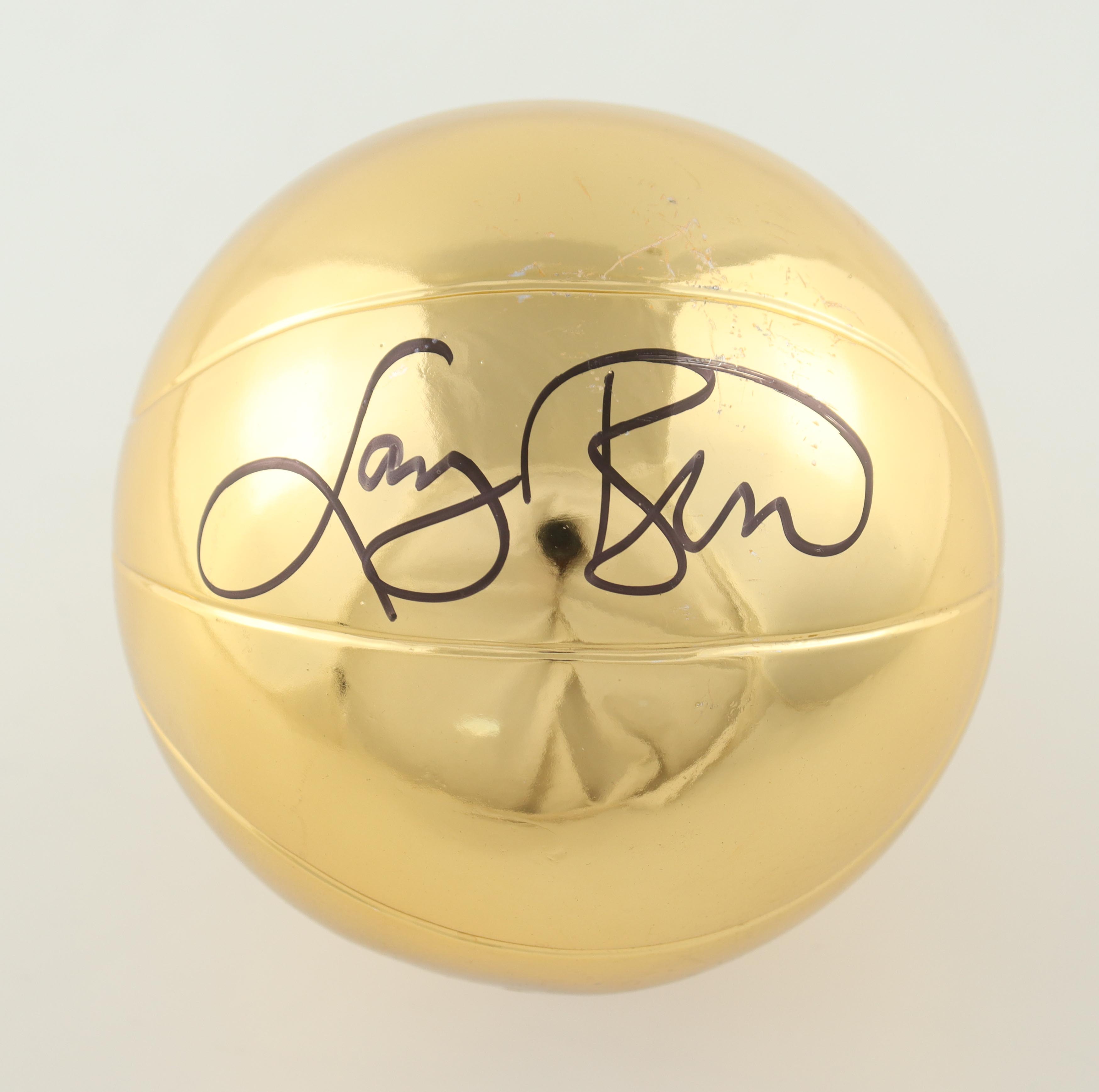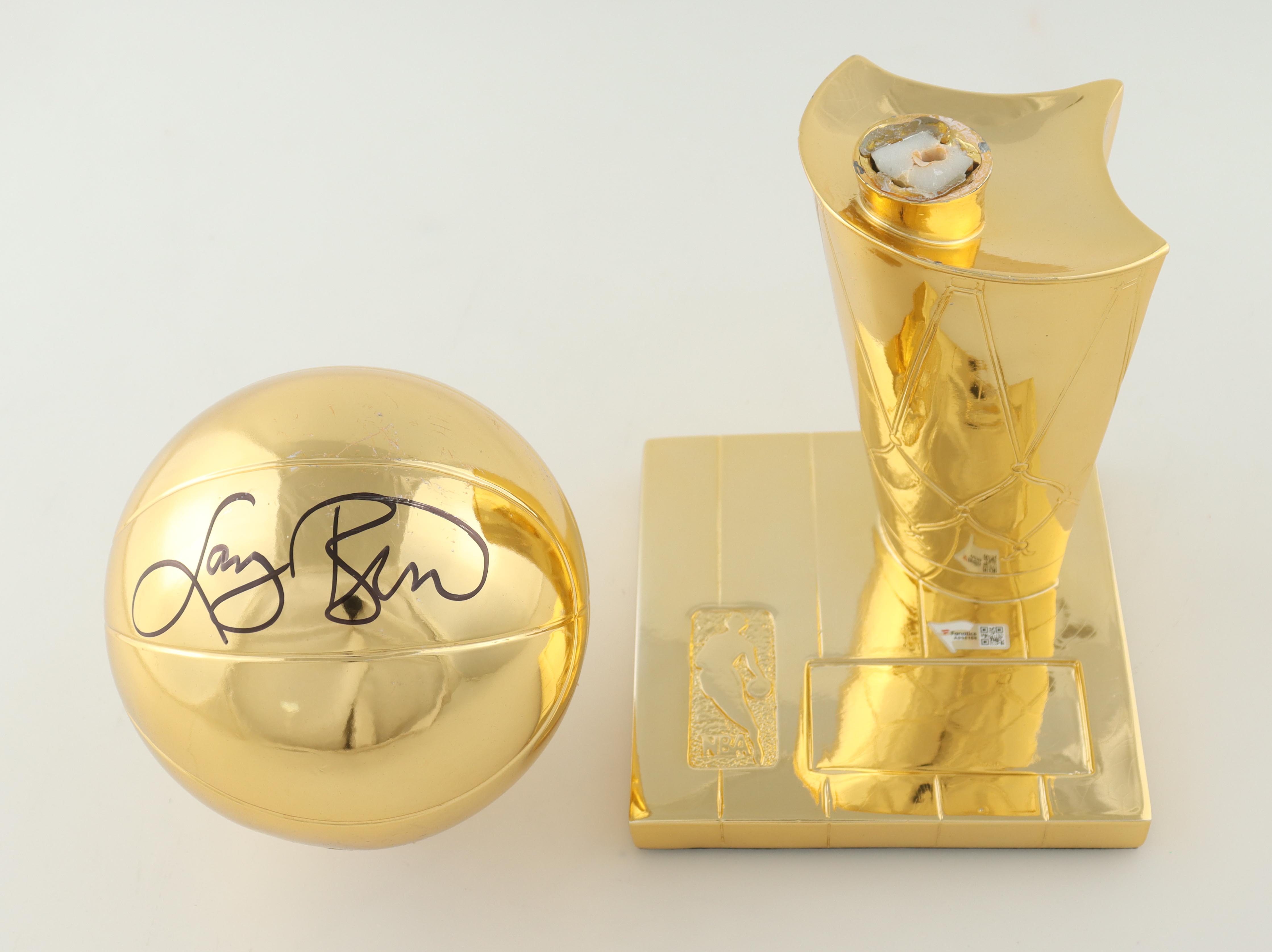 Replica championship trophy measures approximately 12" in height and has been hand-signed Larry Bird (HOF). Please note the ball has been broken off the base entirely, see photos for details.