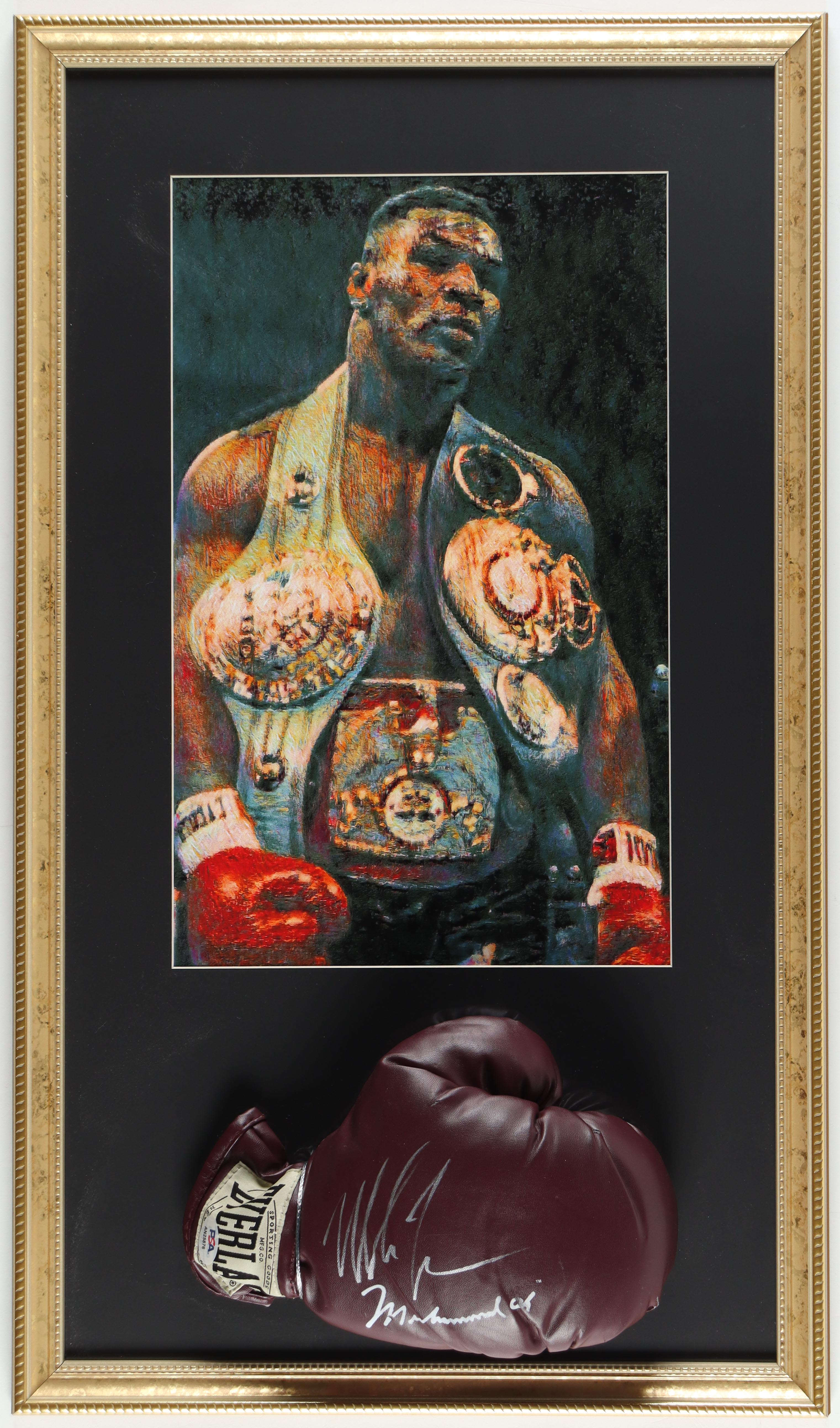 Custom frame measures 17" x 29" in size and features a vintage Everlast Muhammad Ali boxing glove that has been hand-signed by Mike Tyson (HOF). Please note the Ali signature is facsimile.