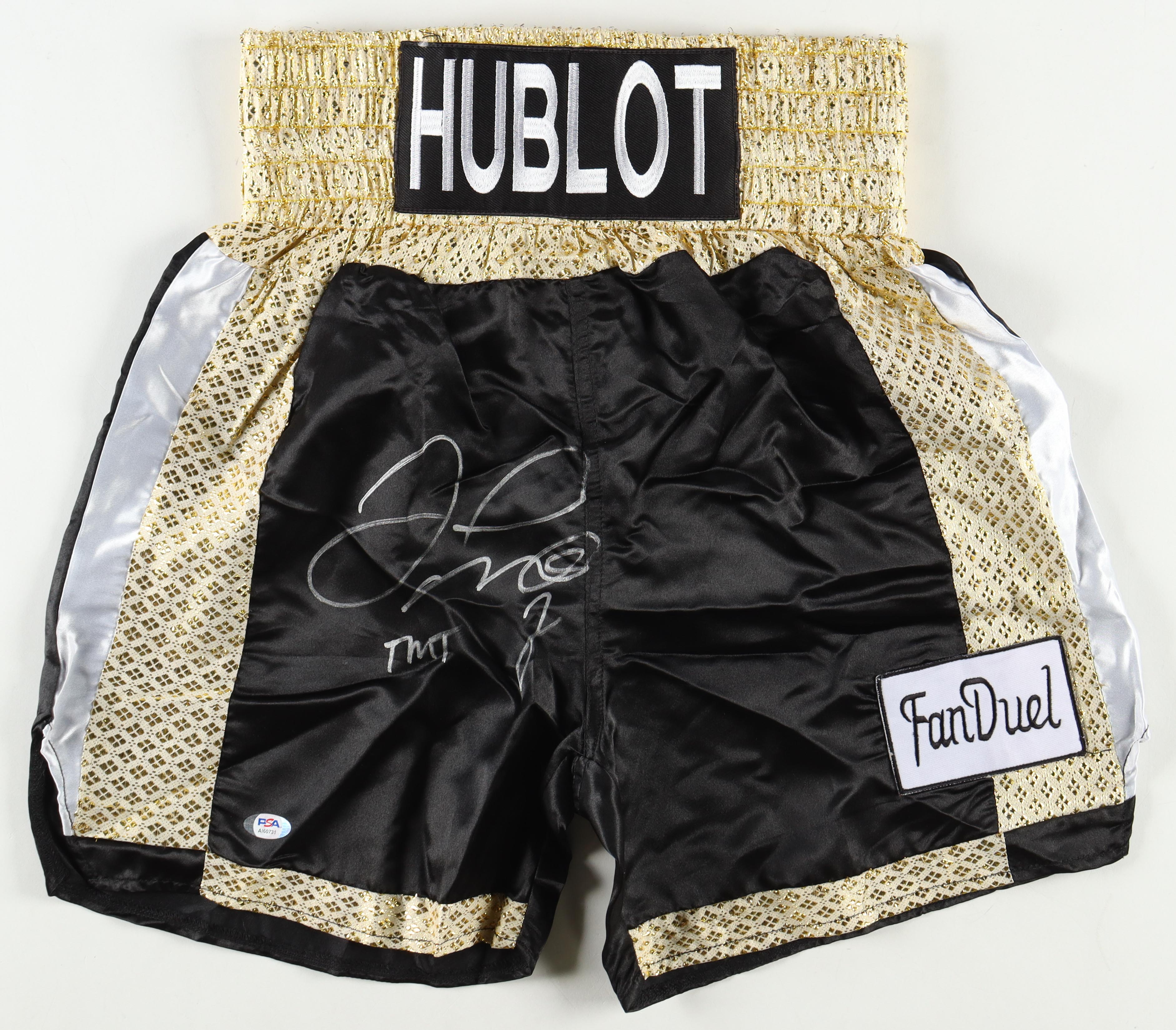 Hublot Fan Duel boxing shorts, size XL. Hand-signed and inscribed by Floyd Mayweather Jr. (HOF).