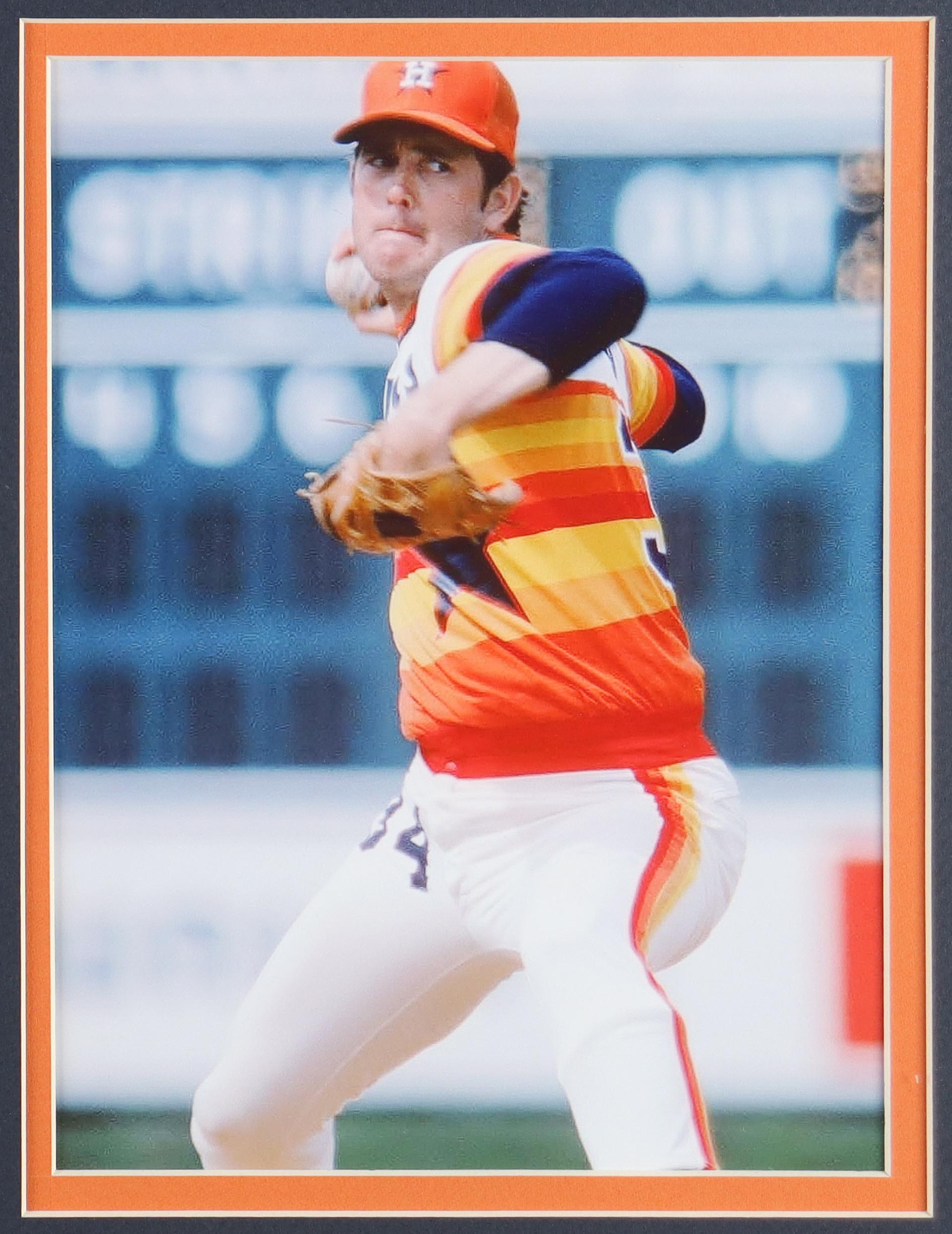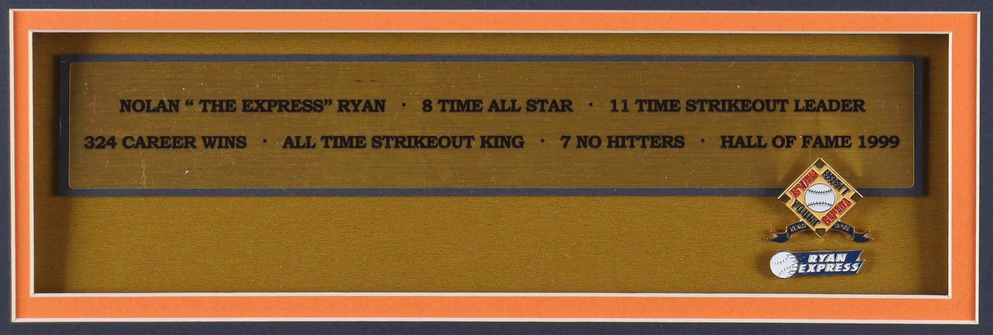 Custom frame measures approximately 33" x 37" in size and features a jersey that has been hand-signed and inscribed by Nolan Ryan (Houston Astros, HOF). DIsplay also includes a 1999 Hall of Fame Induction Pin, "Ryan Express" pin and (2) Astros logo patches. Please refer to photos for more details on the condition of the item.