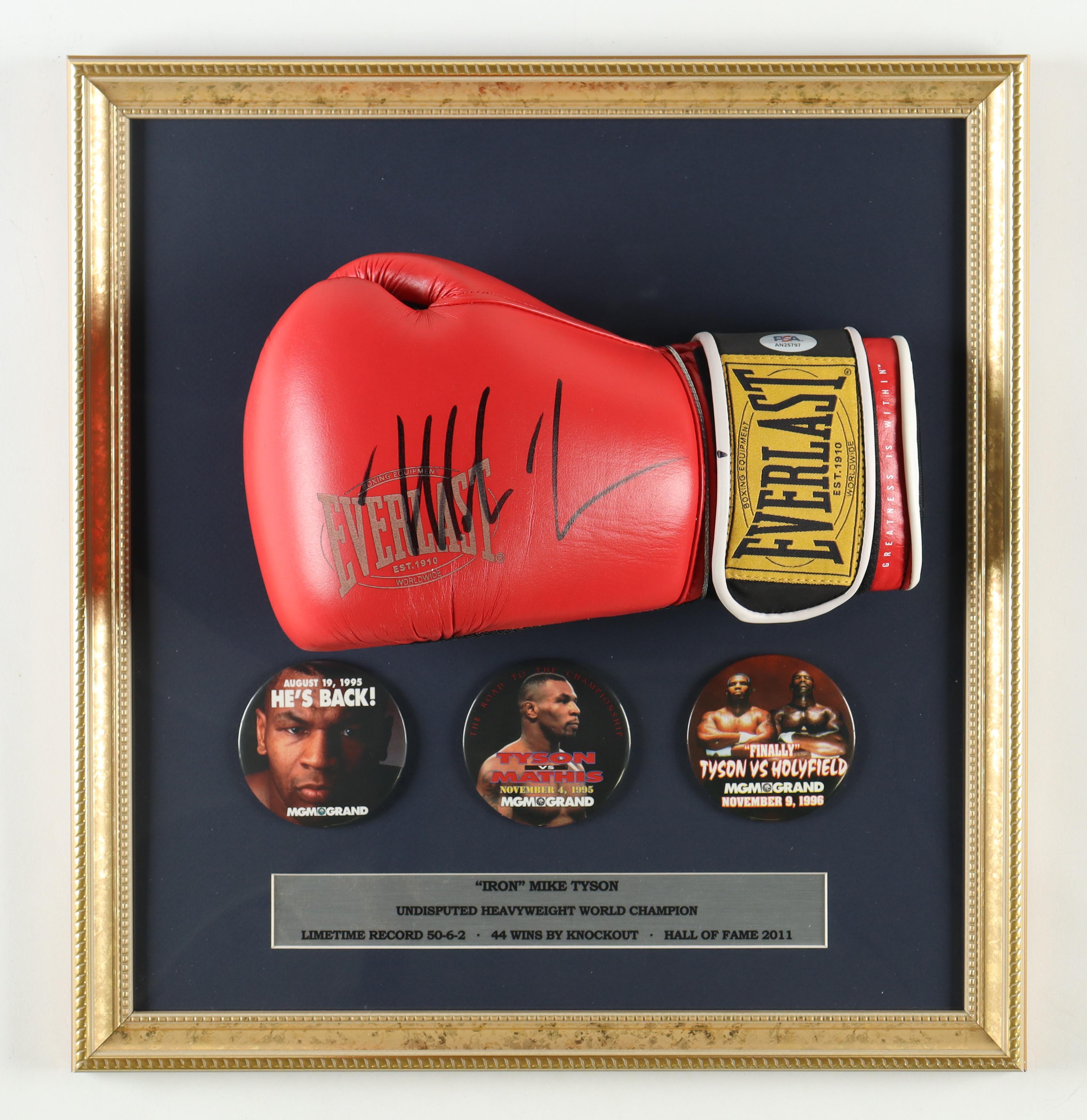 Custom frame measures approximately 17" x 18" in size and features an Everlast boxing glove that has been hand-signed by Mike Tyson (HOF). The display also includes (3) MGM Grand Fight Pins.