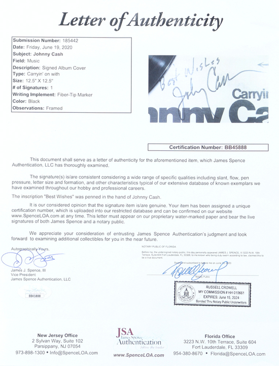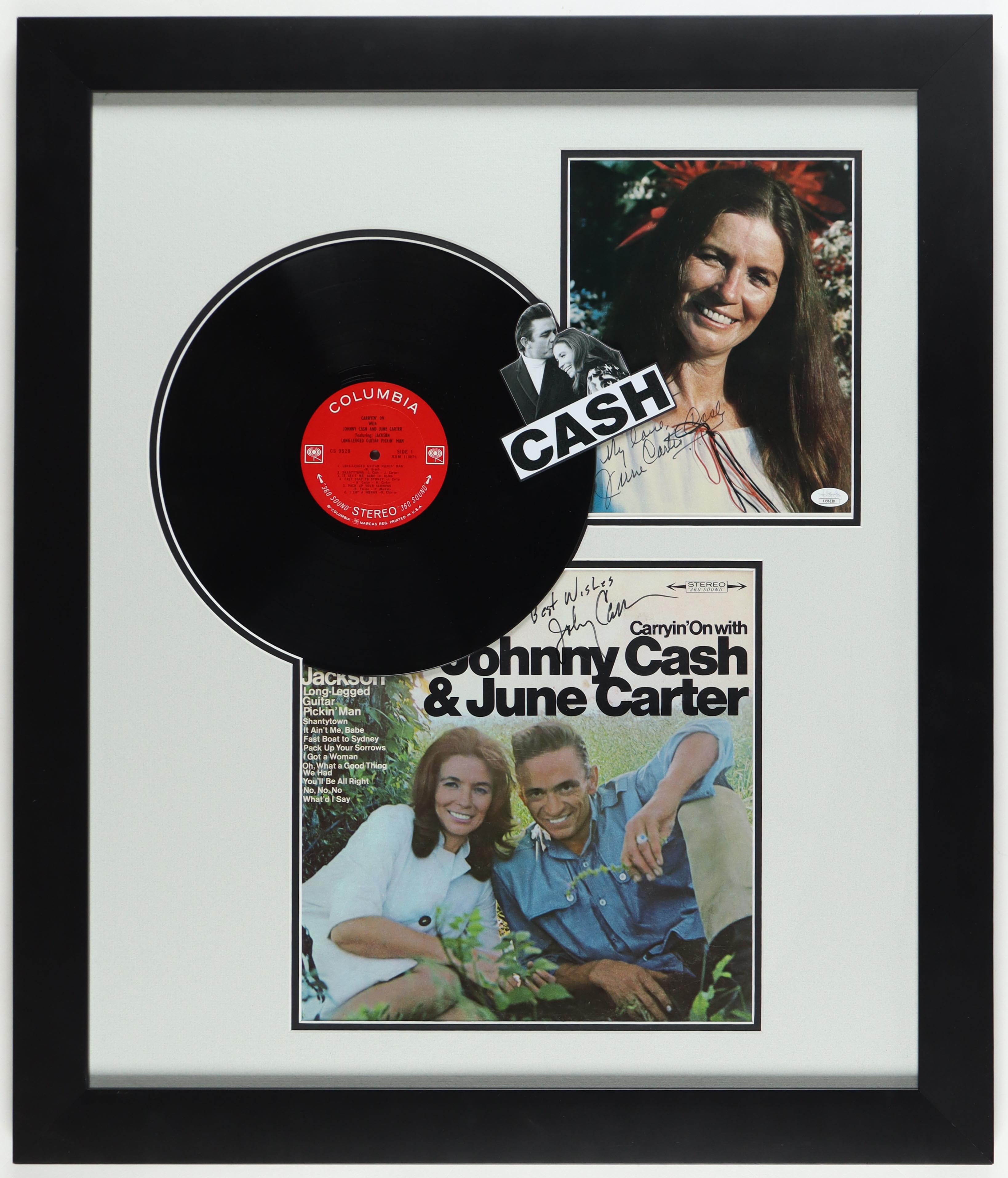 Custom frame measures approximately 26" x 31" in size and features a "Carryin' On with Johnny Cash & June Carter" album cover that has been hand-signed and inscribed by Johnny Cash! Included with the framed display is a 8" x 10" photo that has been hand-signed and inscribed June Carter! Don't miss out this opportunity to collect a piece featuring (2) all-time classic voices!