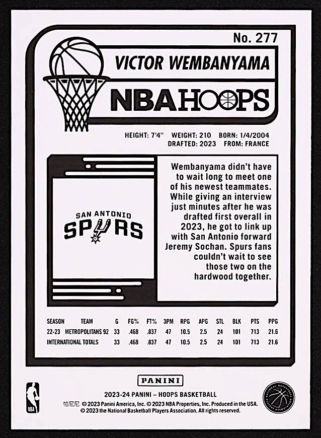 Victor Wembanyama 2023-24 Hoops #277 RC
