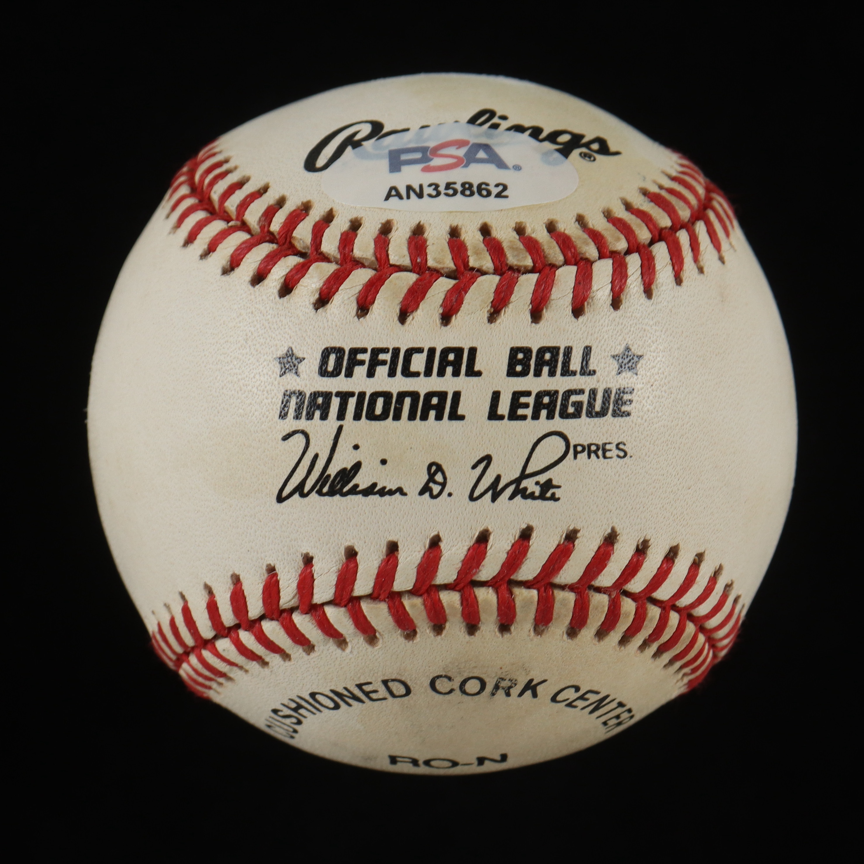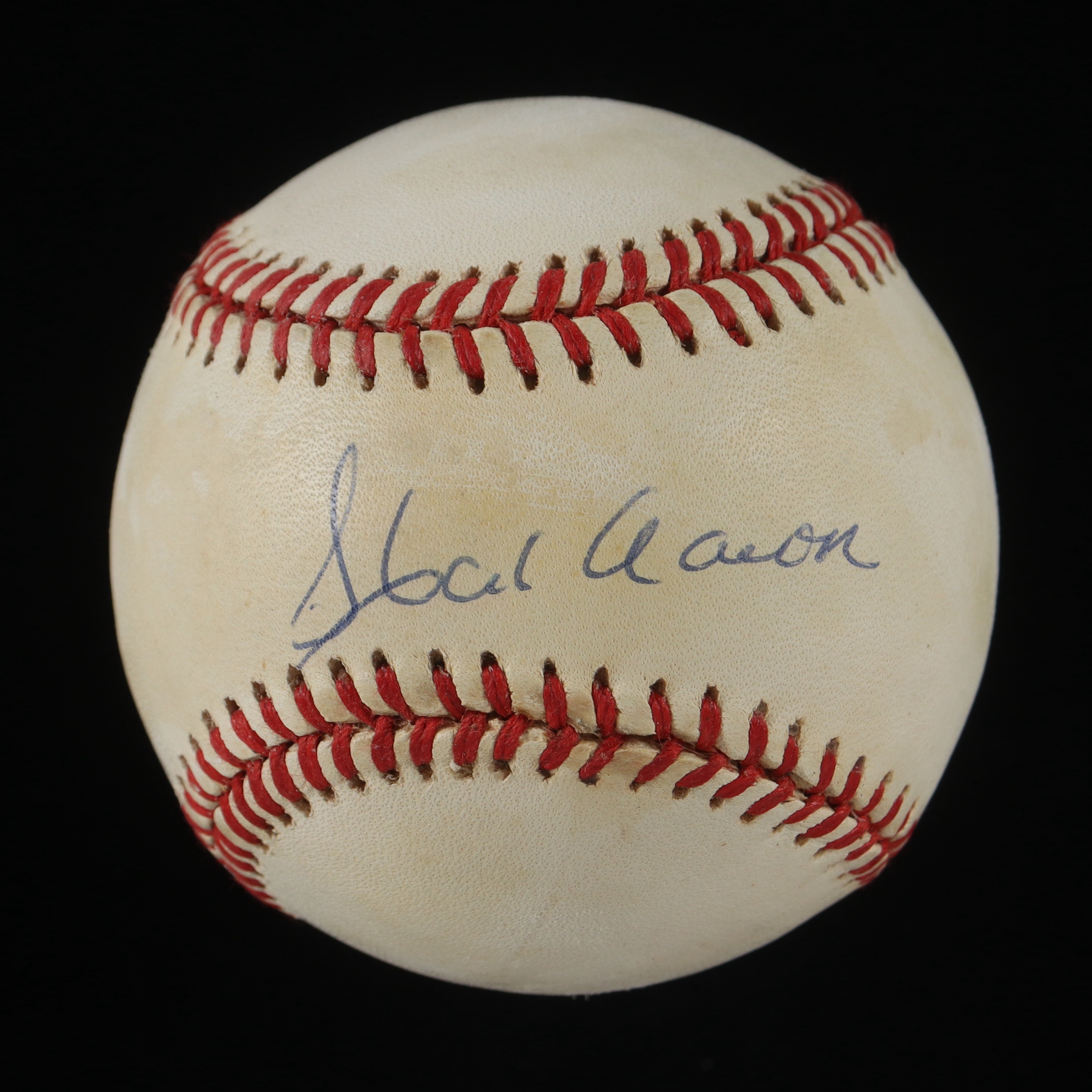 Rawlings Official National League baseball. Hand-signed by Hank Aaron (D. 2021, HOF). Please note, baseball is naturally toning. Refer to photos for more details on the condition of the item.