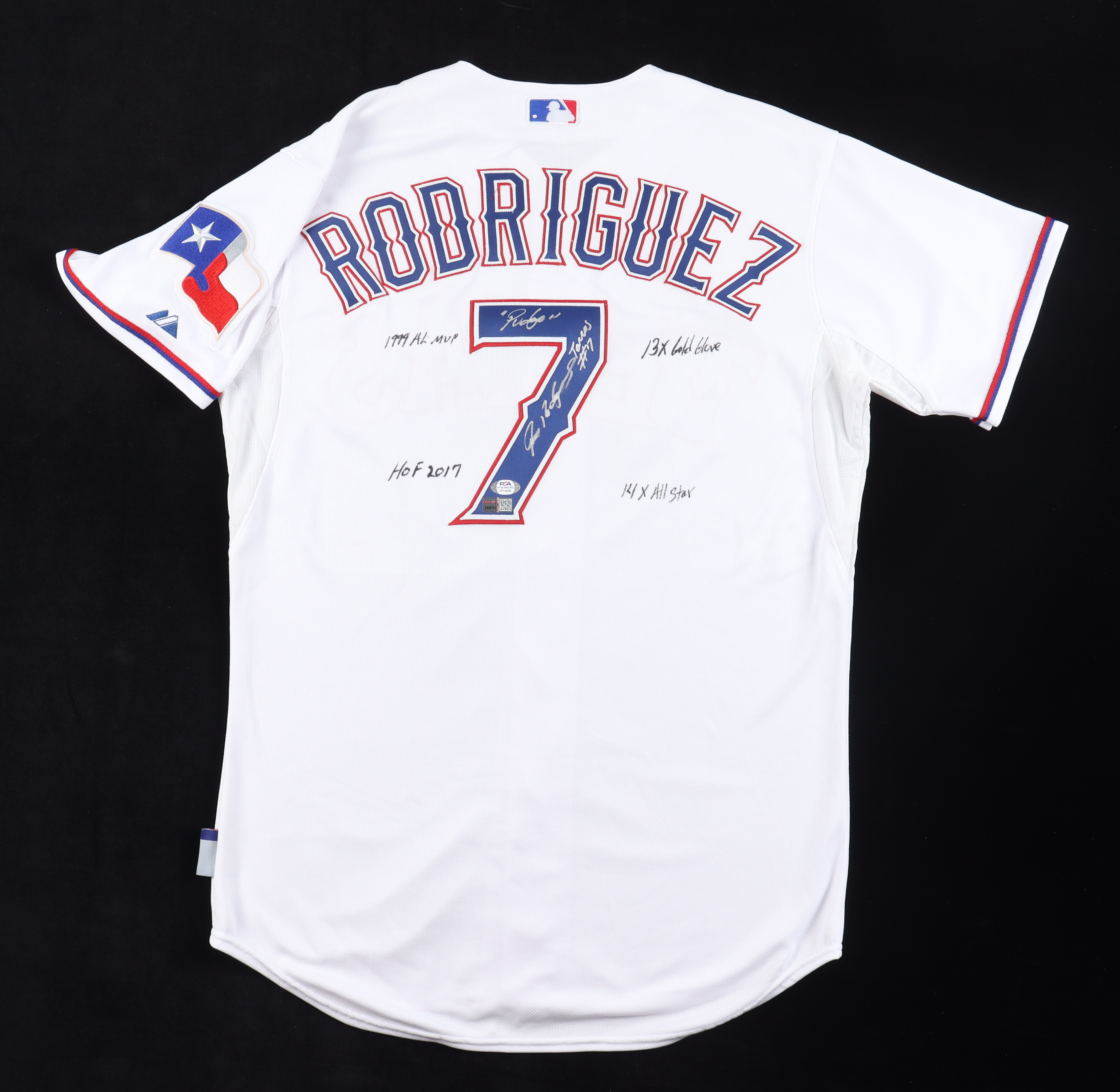 Authentic Majestic style jersey with everything sewn on, size 44, has been hand-signed and inscribed by Texas Rangers legend, Ivan Rodriguez! Rodriguez has signed his signature on the reverse "7" and has accompanied his signature with (6) total career inscriptions! Don't miss out on this unique piece by one of the best catchers of all time! The inscriptions that Rodriguez wrote include: