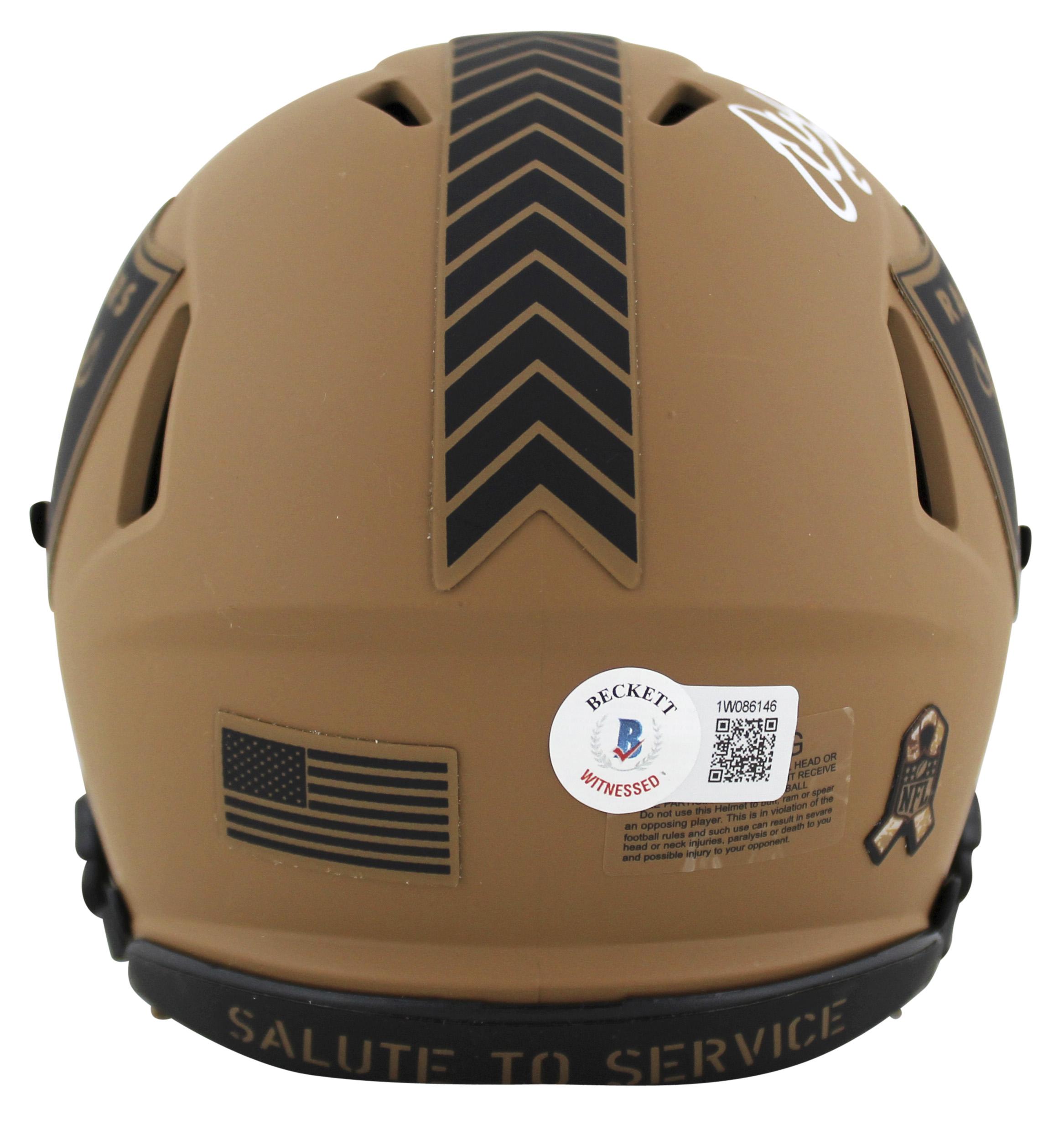 Riddell Las Vegas Raiders Salute To Service Alternate Speed Mini Helmet has been hand-signed and inscribed by Warren Sapp (HOF).