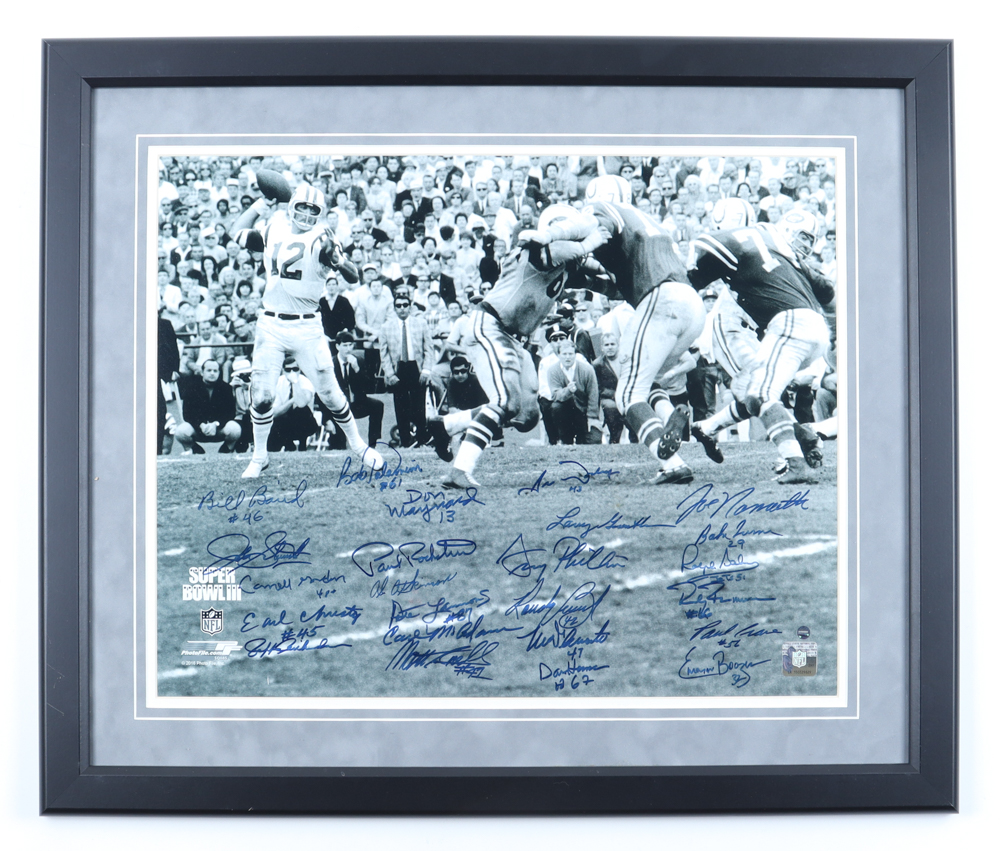 Custom framed photo display measures approximately 22.5" x 26.5" in size and has been hand-signed by (24) including Joe Namath, Don Maynard, Bake Turner, Pete Lammons, Dave Herman, John Schmitt, Bob Talamini, Randy Rasmussen, Gerry Philbin, Paul Rochester, Carl McAdams, Al Atkinson, Ralph Baker, Larry Grantham, Bill Baird, Cornell Gordon, Randy Beverly, John Dockery, Earl Christy, Paul Crane, Jeff Richardson, Mike D'Amato, Emerson Boozer and Matt Snell. Please note, there are scratches on the frame borders.