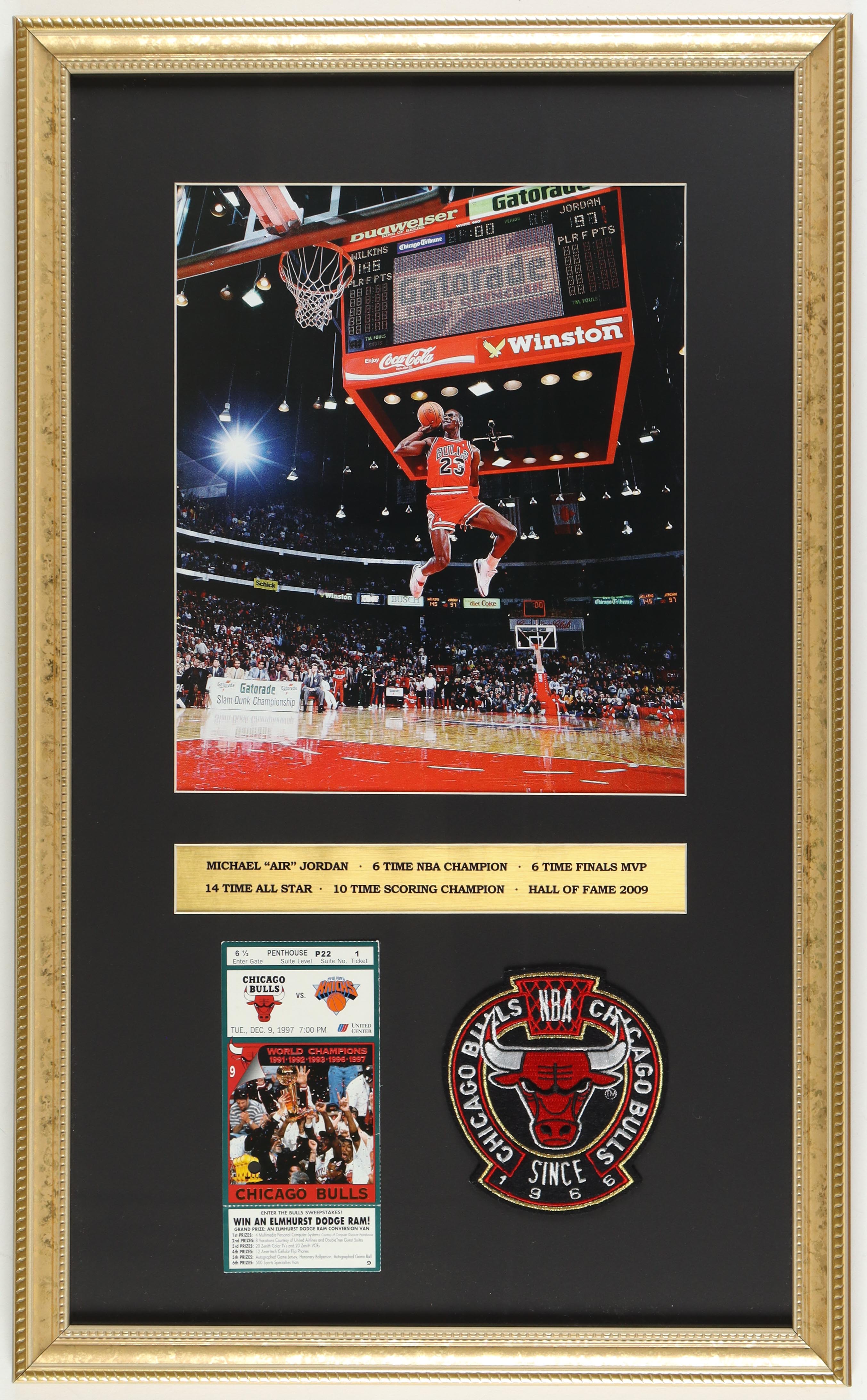Michael Jordan Bulls "Dunk Contest" Custom Framed Photo Display with 1997 Bulls Vs Knicks Game Ticket & Logo Cloth Patch