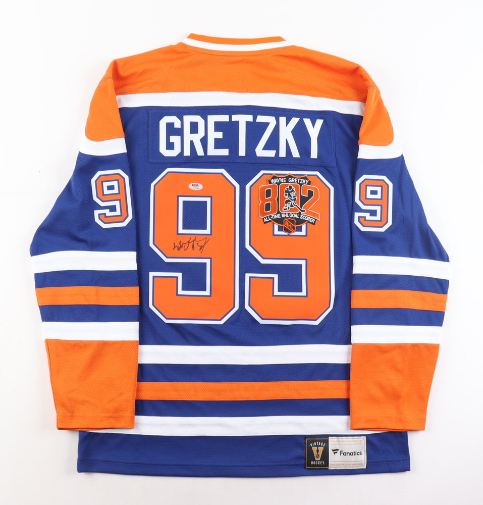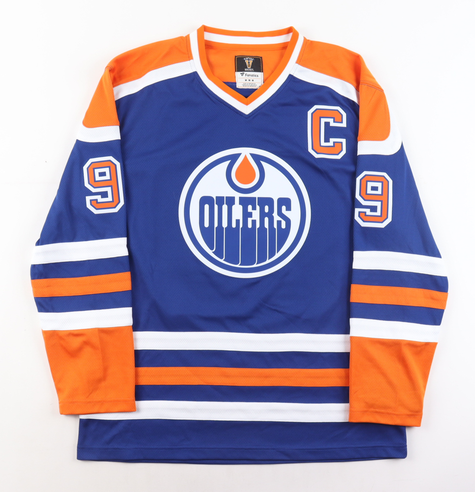 Fanatics jersey. Front logo is sewn on, numbers are pressed on, size M. Hand-signed by Wayne Gretzky (HOF).