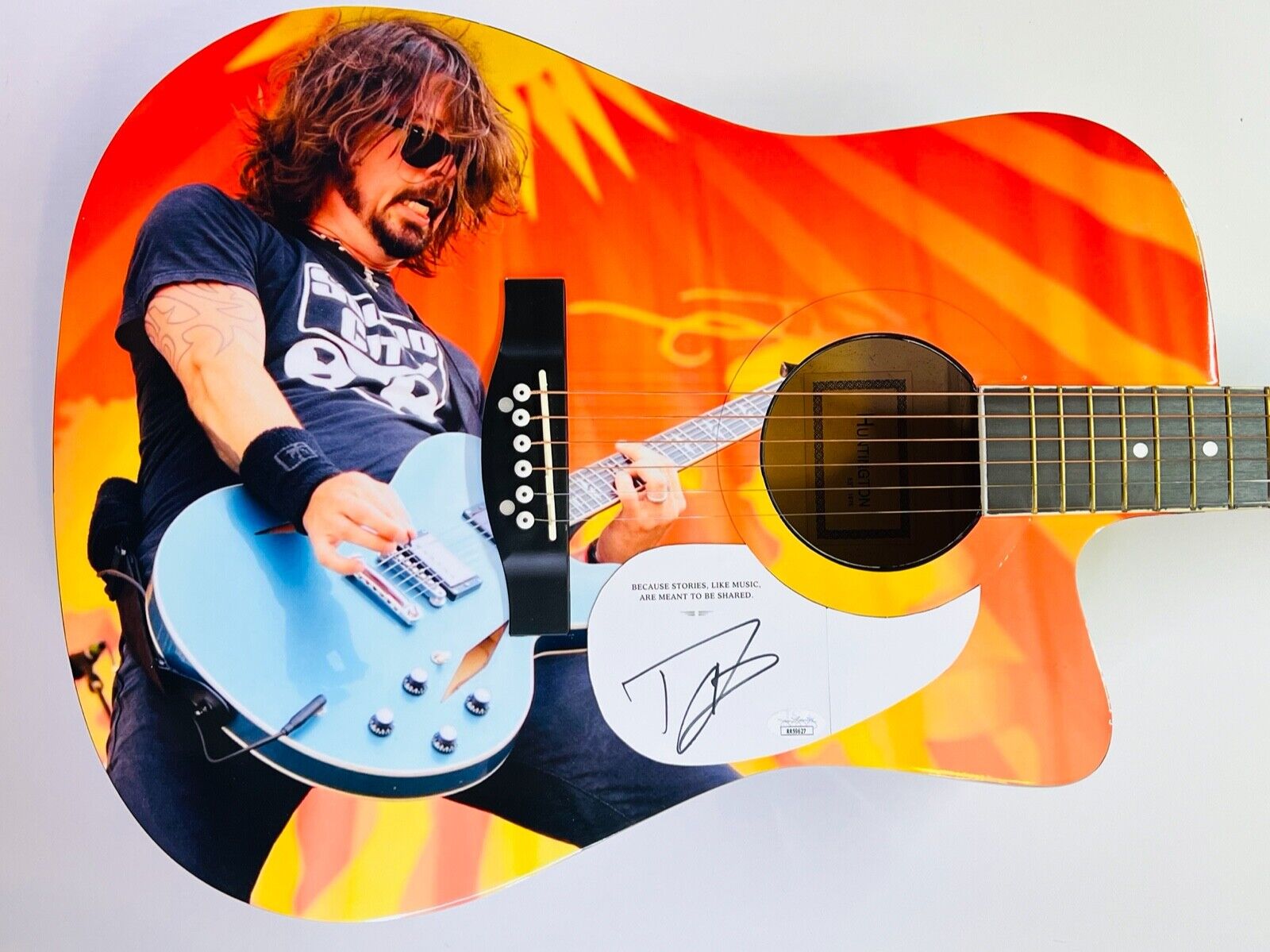 Acoustic Guitar measures approximately 41" in length with custom graphics has been hand-signed by Dave Grohl (Foo Fighters).