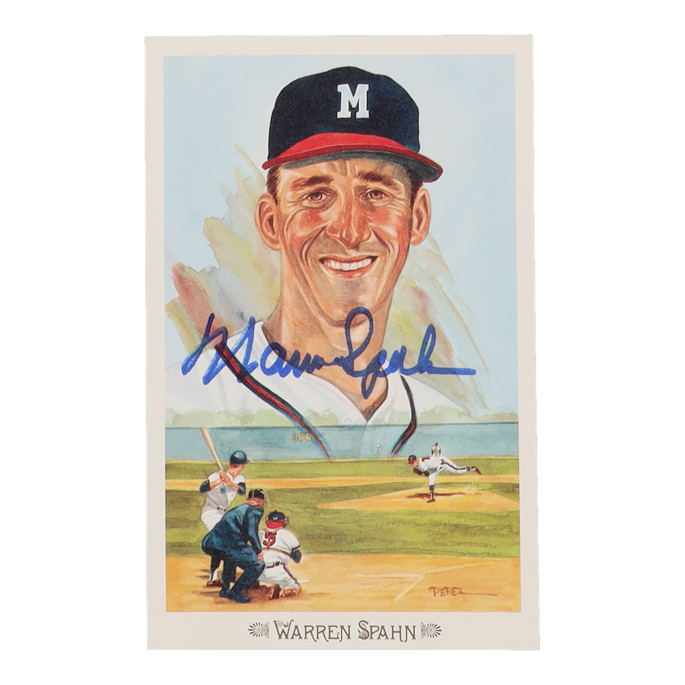Postcard has been hand-signed by Warren Spahn (D. 2003, Cleveland Indians, HOF). Postcard is limited edition numbered #5,816/10,000.