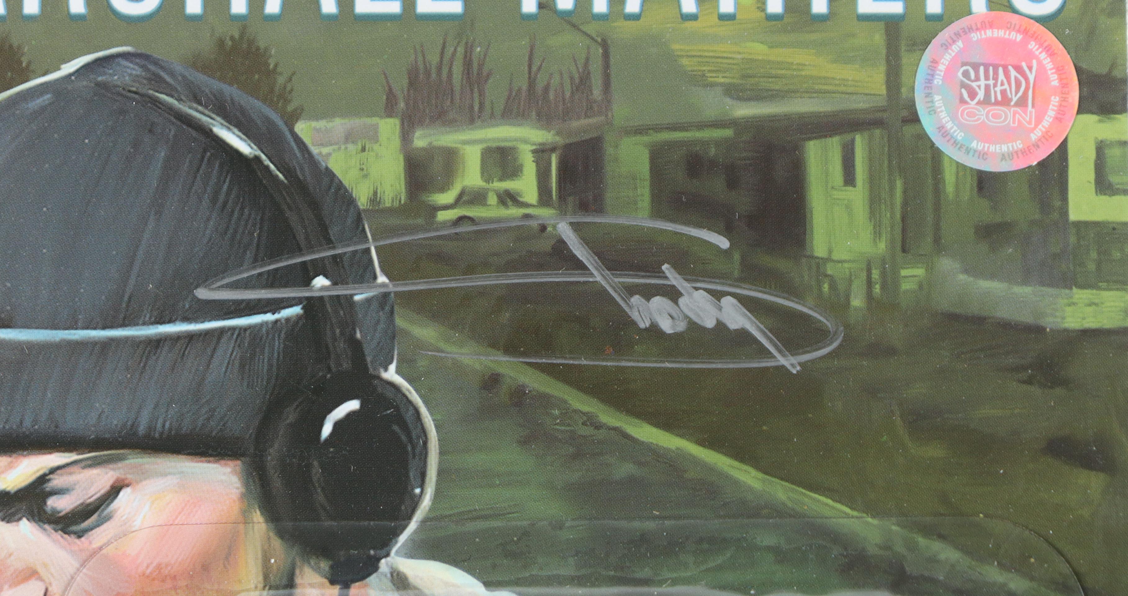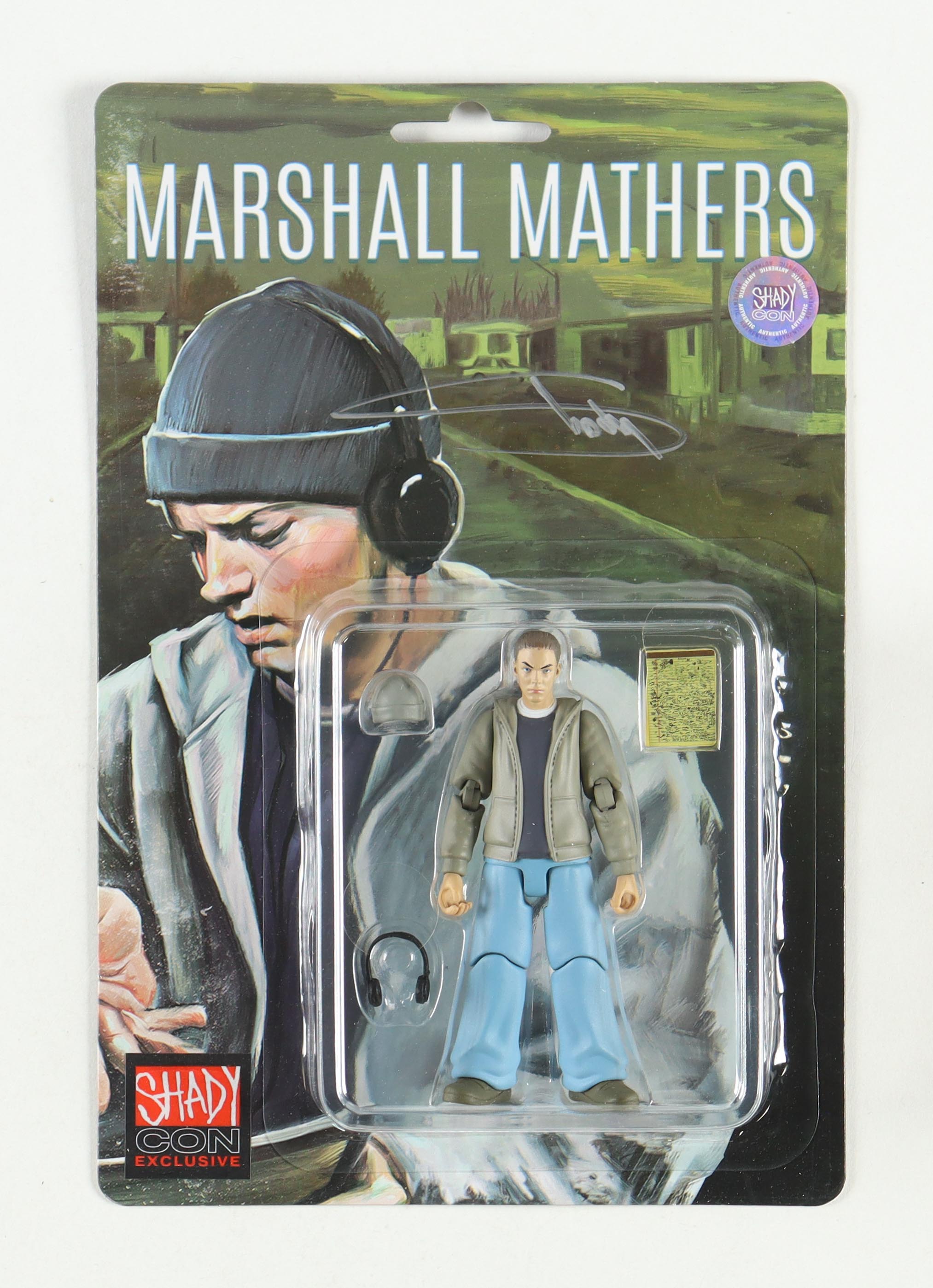 Universal Music Group "Marshall Mathers" action figure measures approximately 7" x 10" with encapsulation. Hand-signed on the packaging by Eminem. Action figure comes with a custom display case.