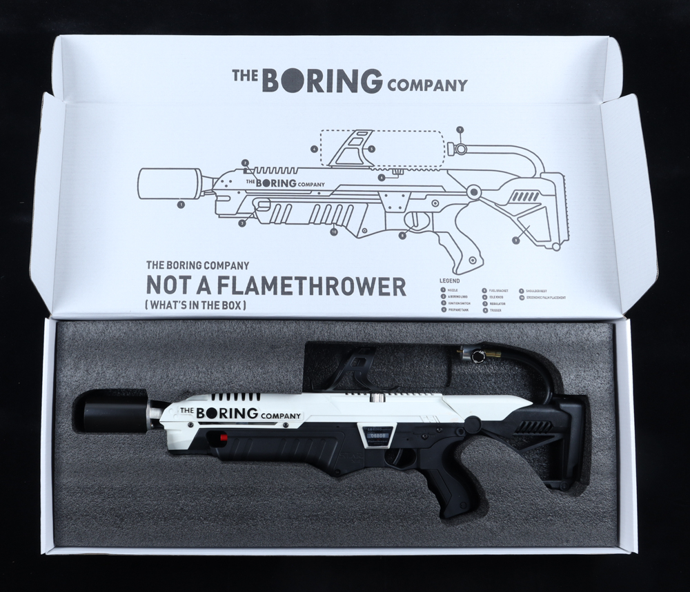 From the mind of Elon Musk and the most boring company in the world comes "Not a Flamethrower". This item has never been taken out of the box meaning that you could be the first person ever to fire the serial number: 06806 "Not a Flamethrower" and show all of your friends and family that you are indeed not boring as the LOA states.