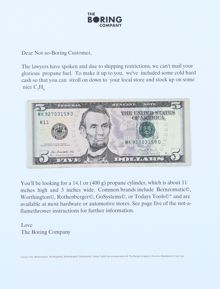 The "Not a Flamethrower" does not include propane and the fire extinguisher is sold separately.
