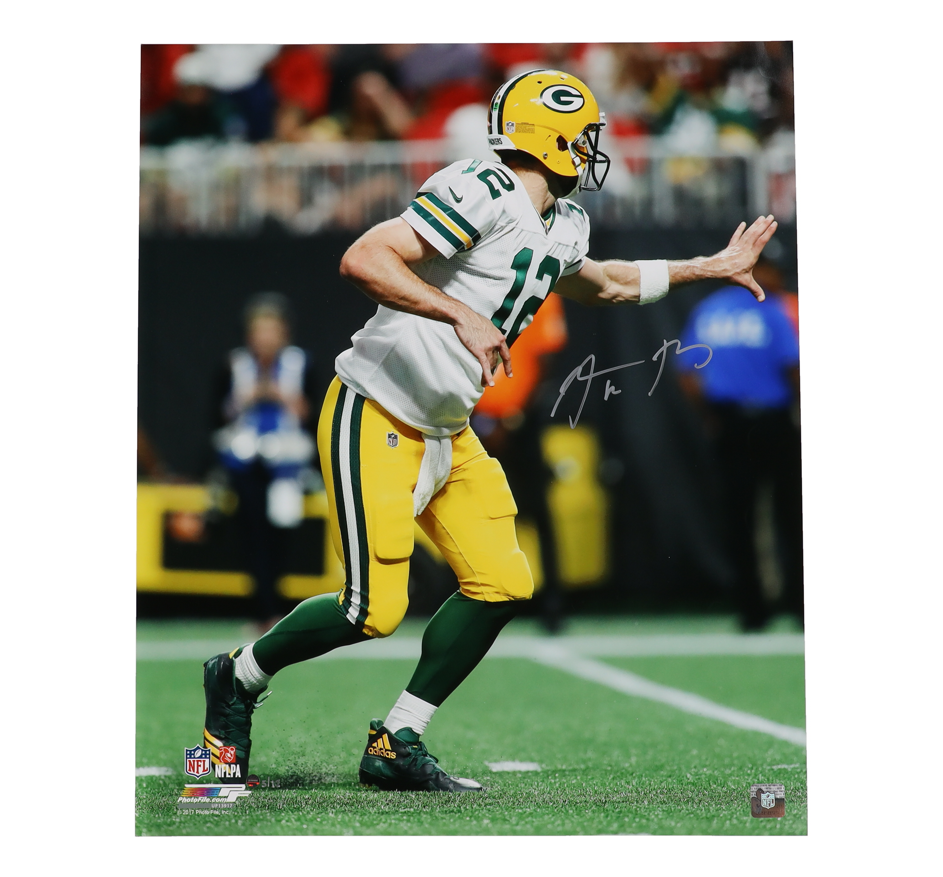 Photo measures 20" x 24" in size. Hand-signed by Aaron Rodgers (Green Bay Packers). Photo is limited edition hand-numbered #5/12.