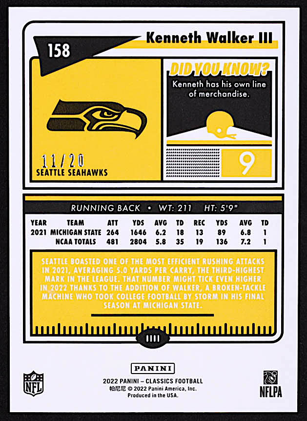 Kenneth Walker III 2022 Classics Premium Edition Timeless Tributes Green #158 RC #11/20
