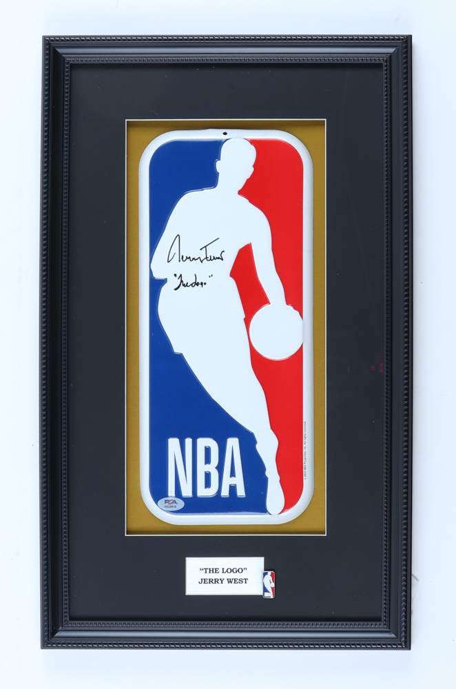 Custom frame measures approximately 14" x 23" in size and features a metal NBA logo sign. Hand-signed and inscribed by Jerry West (Los Angeles Lakers, HOF). The display also includes a NBA logo pin.