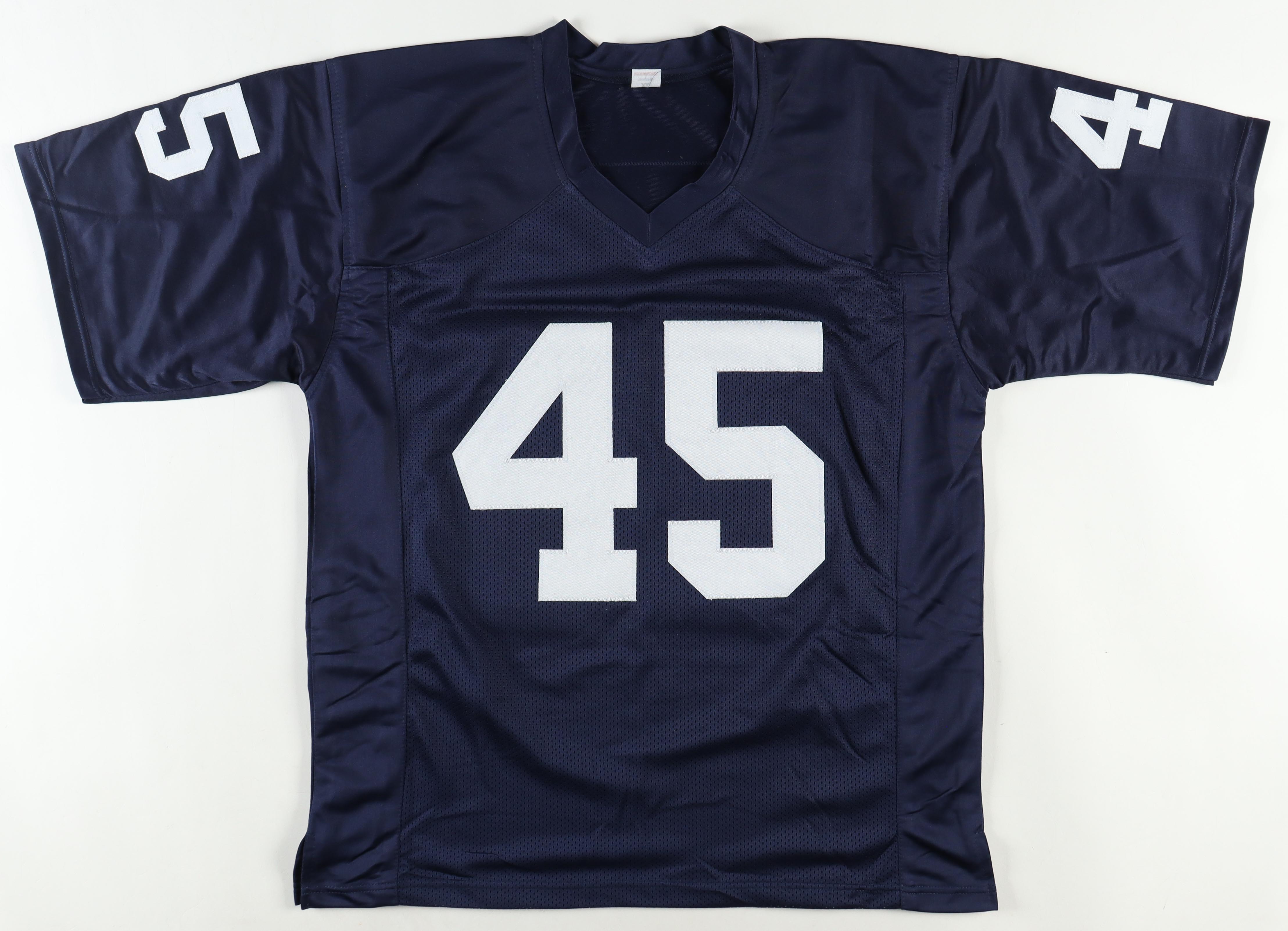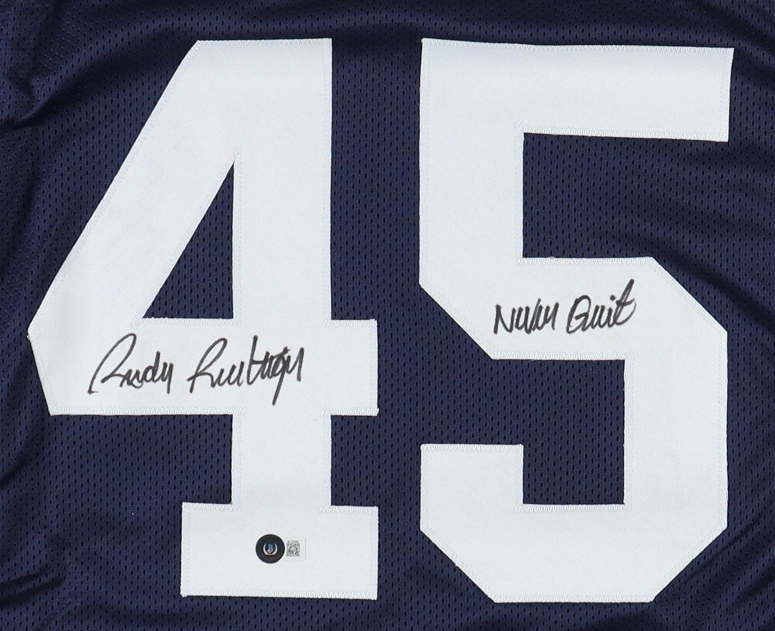Custom jersey with everything sewn on, size XL. Hand-signed and inscribed by Rudy Ruettiger.