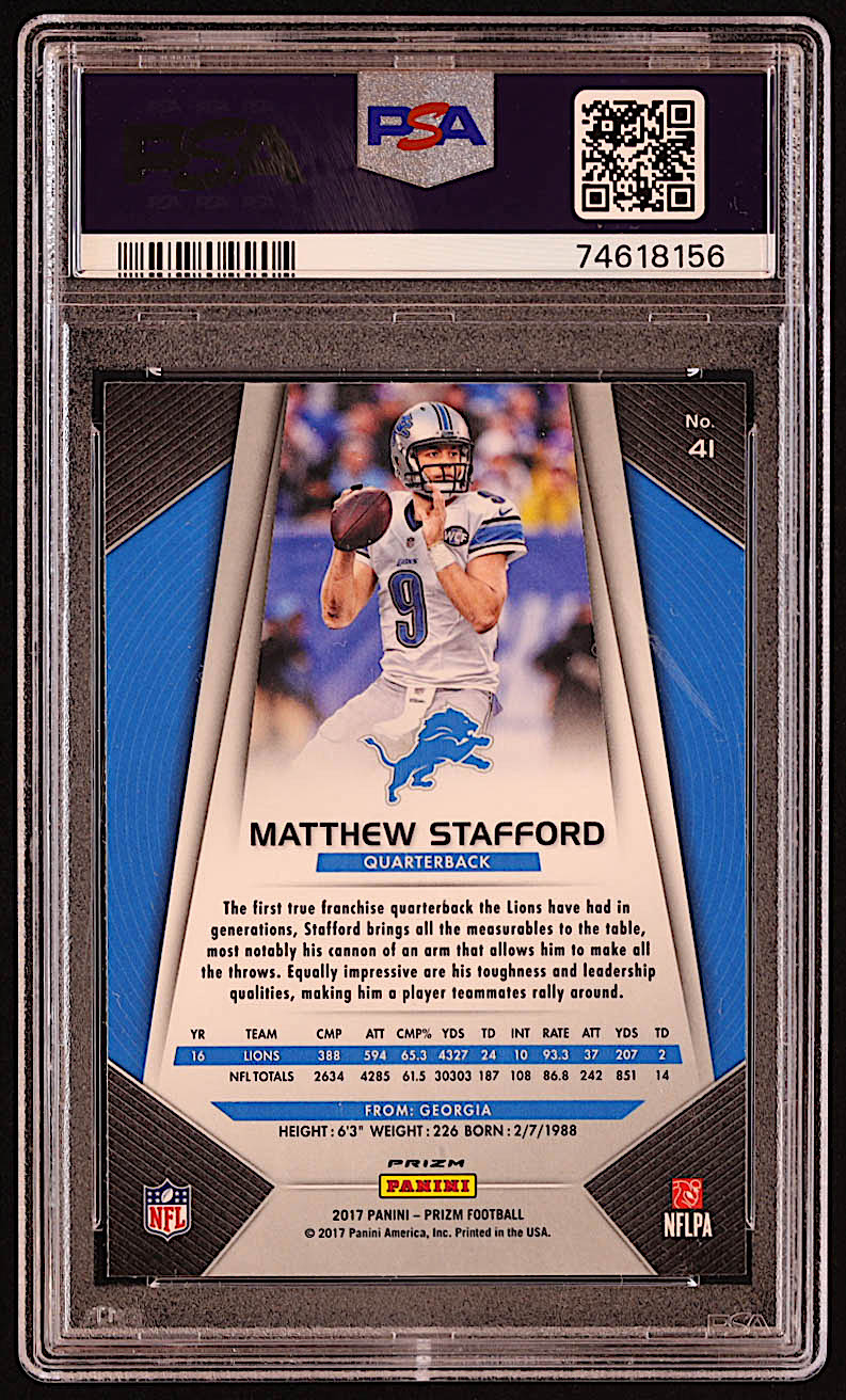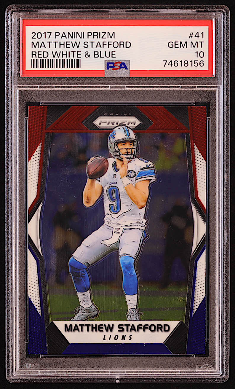 Matthew Stafford 2017 Panini Prizm Prizms Red White and Blue #41 (PSA 10)
