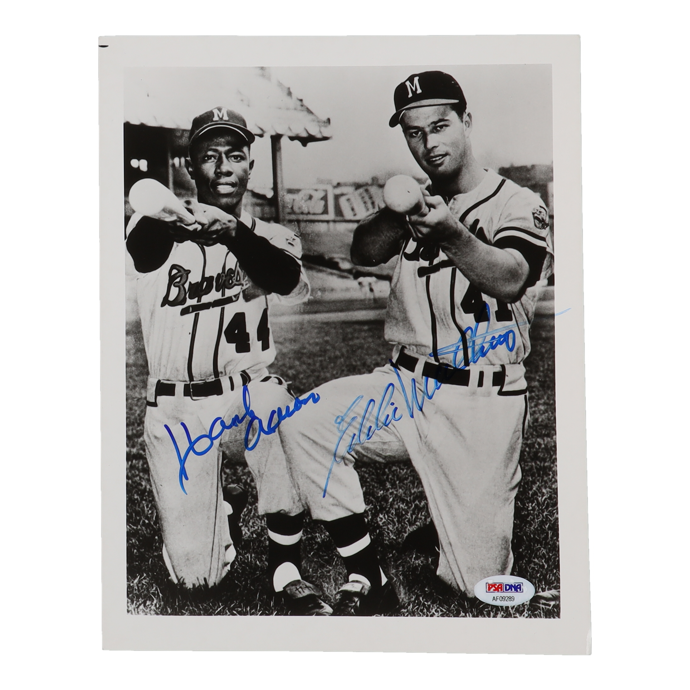 Photo measures 8" x 10" in size and has been hand signed by Hank Aaron (D. 2021, HOF) and Eddie Mathews (D. 2001, Milwaukee Braves, HOF).