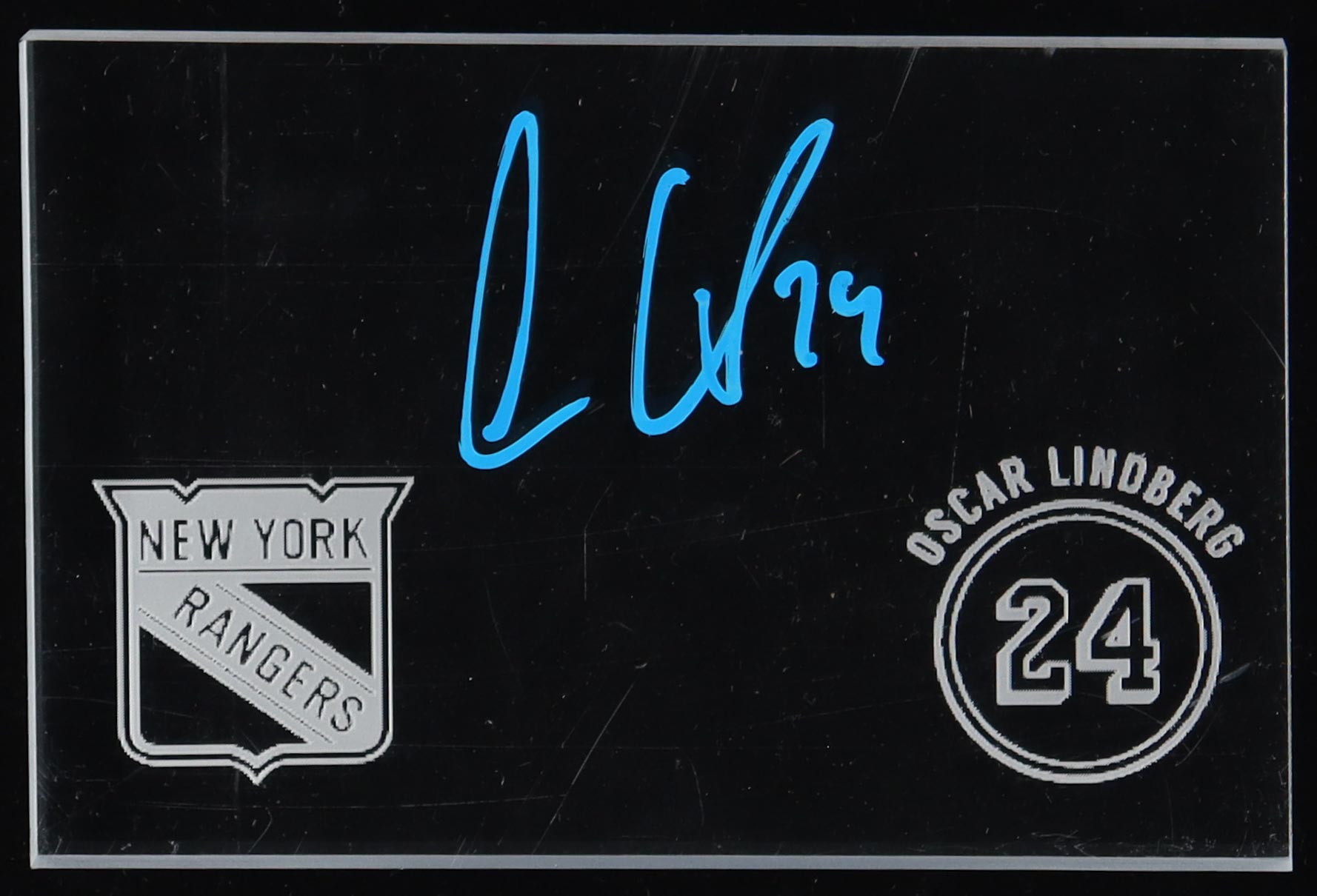 Plexiglass piece measures approximately 4" x 6" in size and has been hand-signed by Oscar Lindberg (New York Rangers). Please note, there are scratches on the plexiglass.