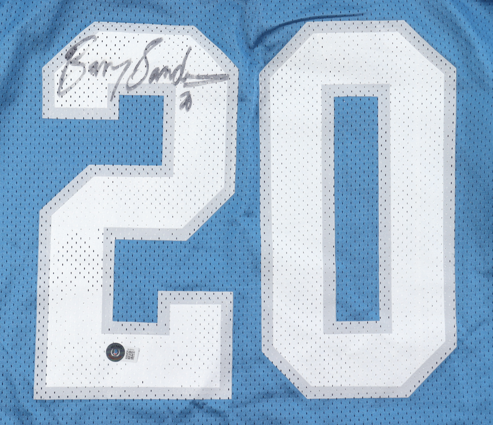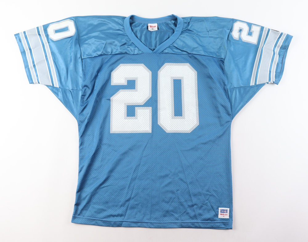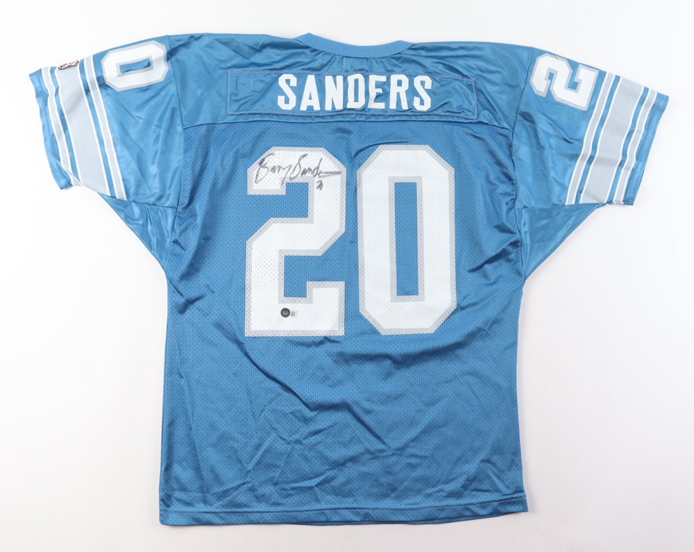 Wilson football jersey. Everything is printed on, size XL. Hand-signed by Barry Sanders (Detroit Lions, HOF). Please note, there is residue on the right shoulder and the signature is smudged.