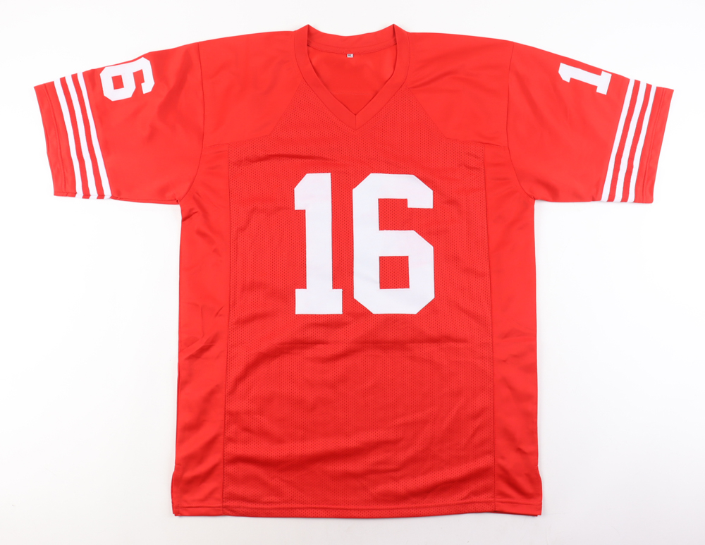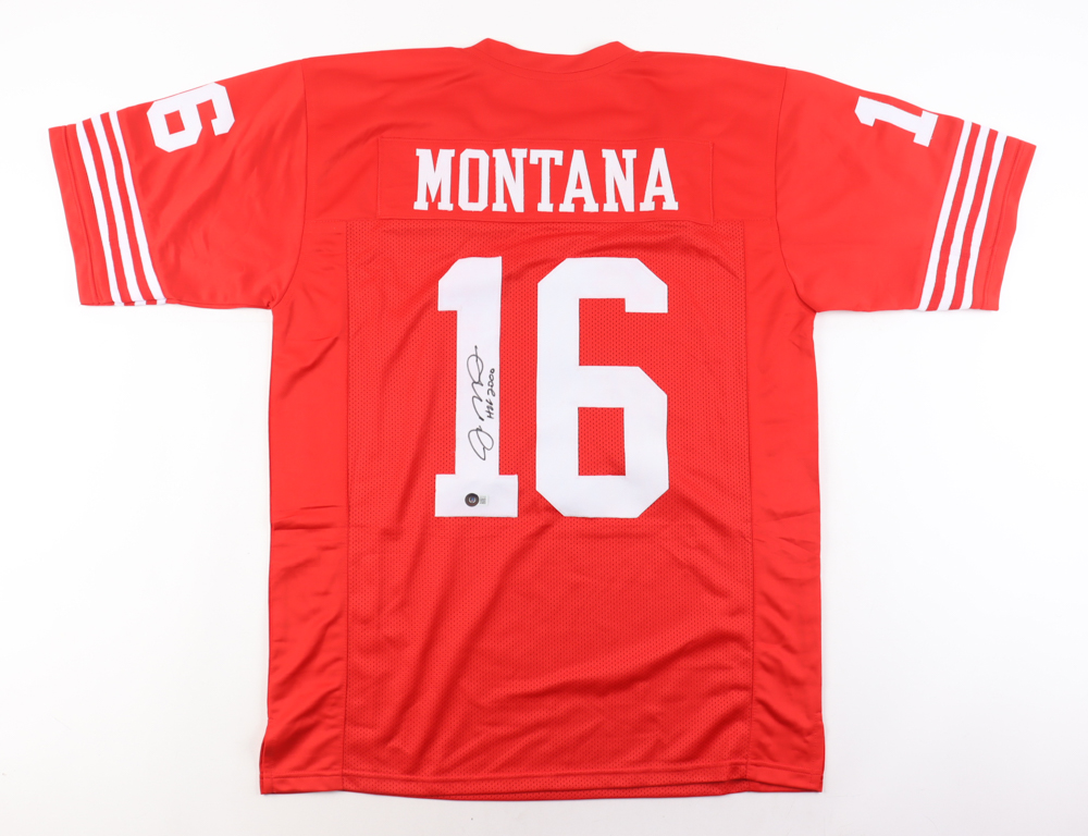 Custom jersey with everything sewn on, size XL. Hand-signed and inscribed by Joe Montana (HOF).
