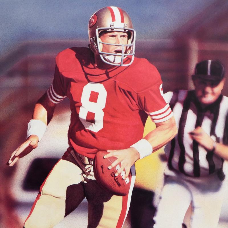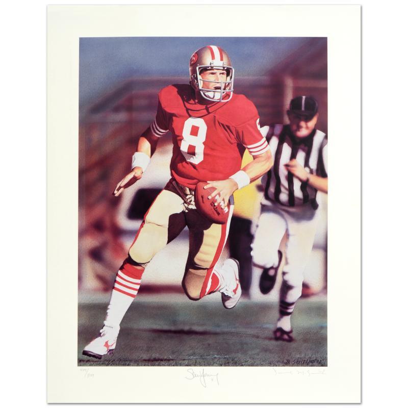 "Run & Shoot (Steve Young)" is a limited edition lithograph on paper dated 1992 by Daniel M. Smith, numbered and hand signed by both the artist and Steve Young. Measures approximately 16" x 21" (with border), 12" x 17" (image).