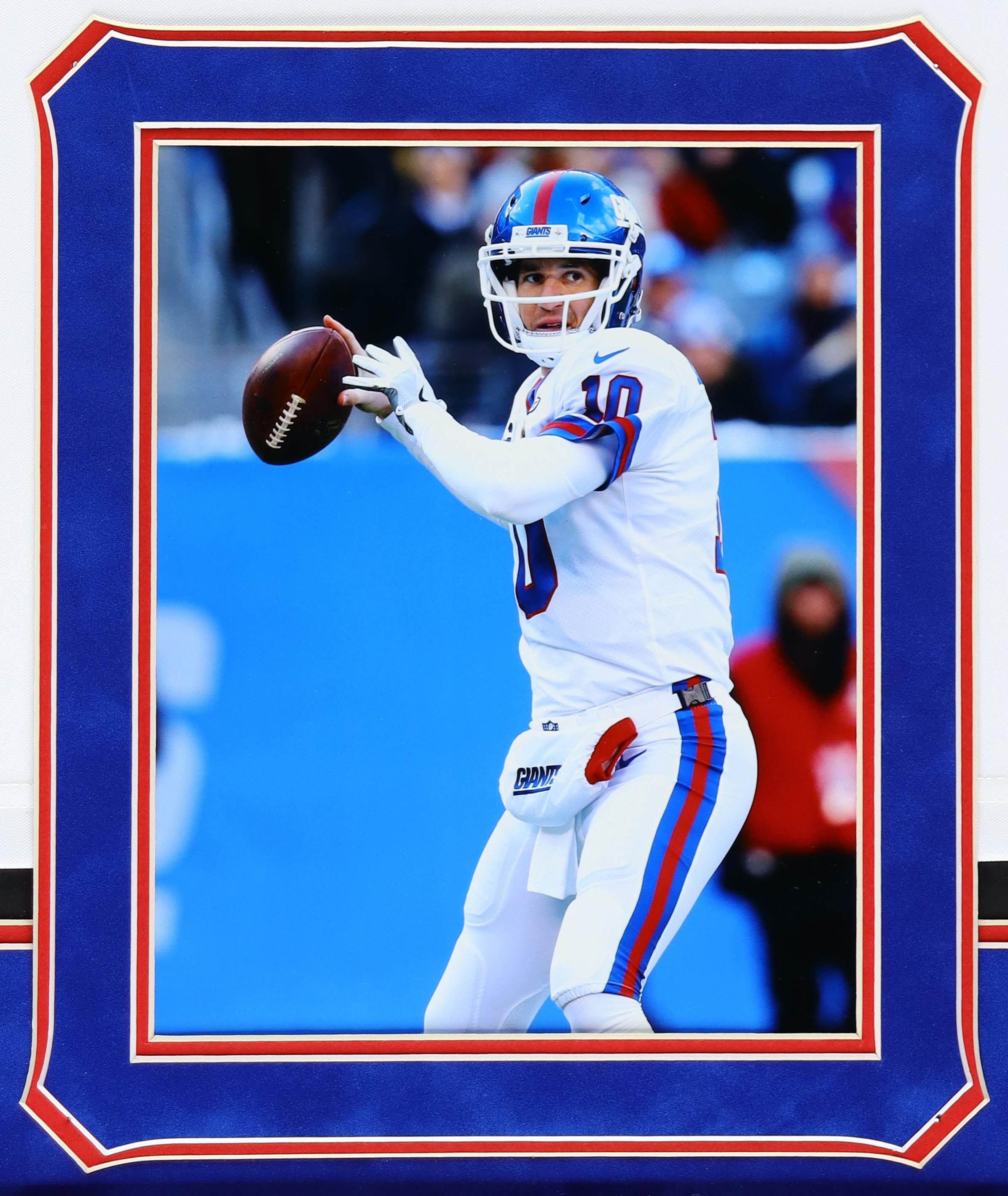 Custom frame measures approximately 35.5" x 43.5" in size and features a Nike jersey that has been hand signed by Eli Manning (New York Giants). Please note, there are scuffing and scratches on the frame borders.