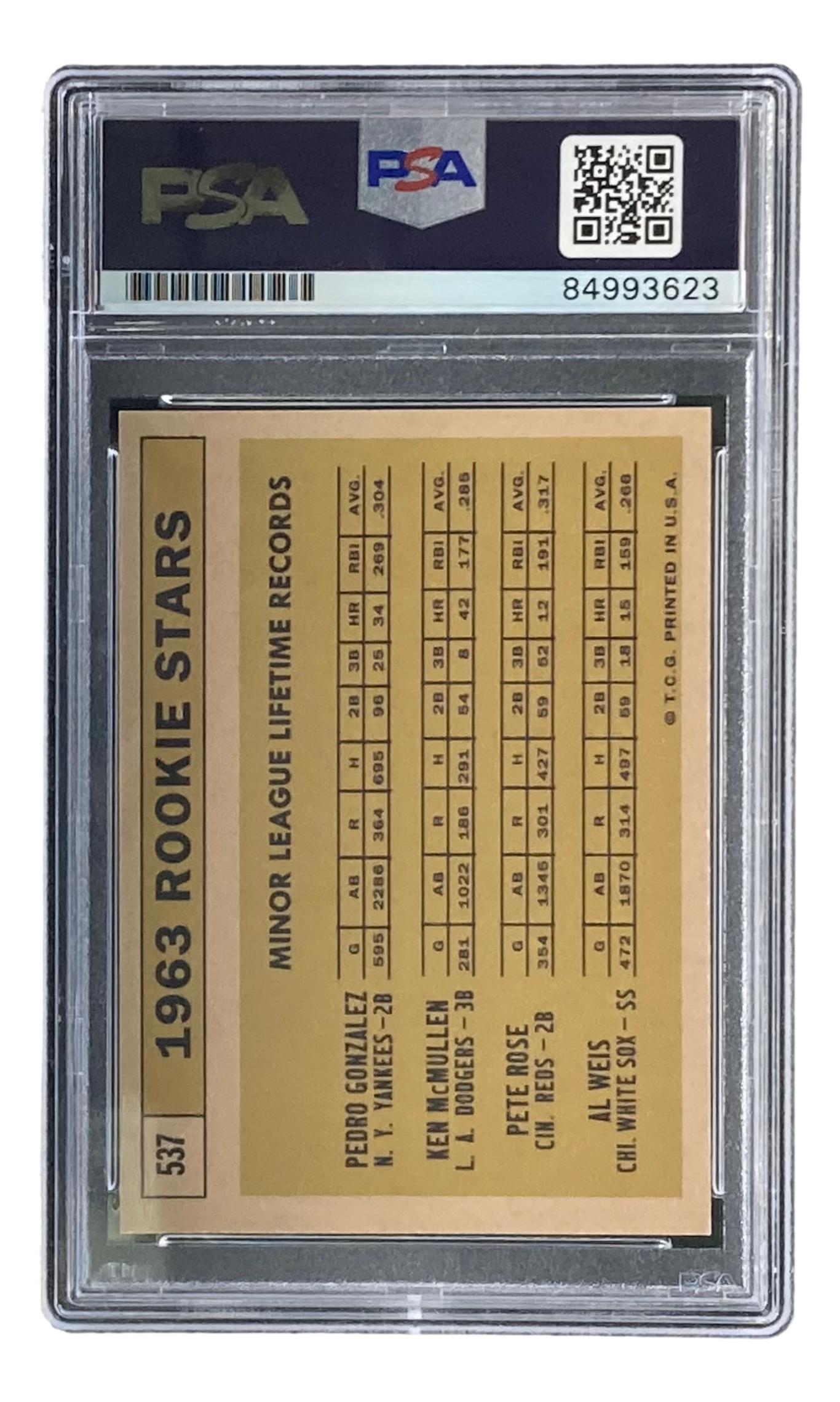 Pete Rose Signed 1963 Topps #537 Rookie Stars / Pedro Gonzalez RC / Ken McMullen RC / Al Weis RC / Pete Rose RC Reprint (PSA | Autograph Graded 9)