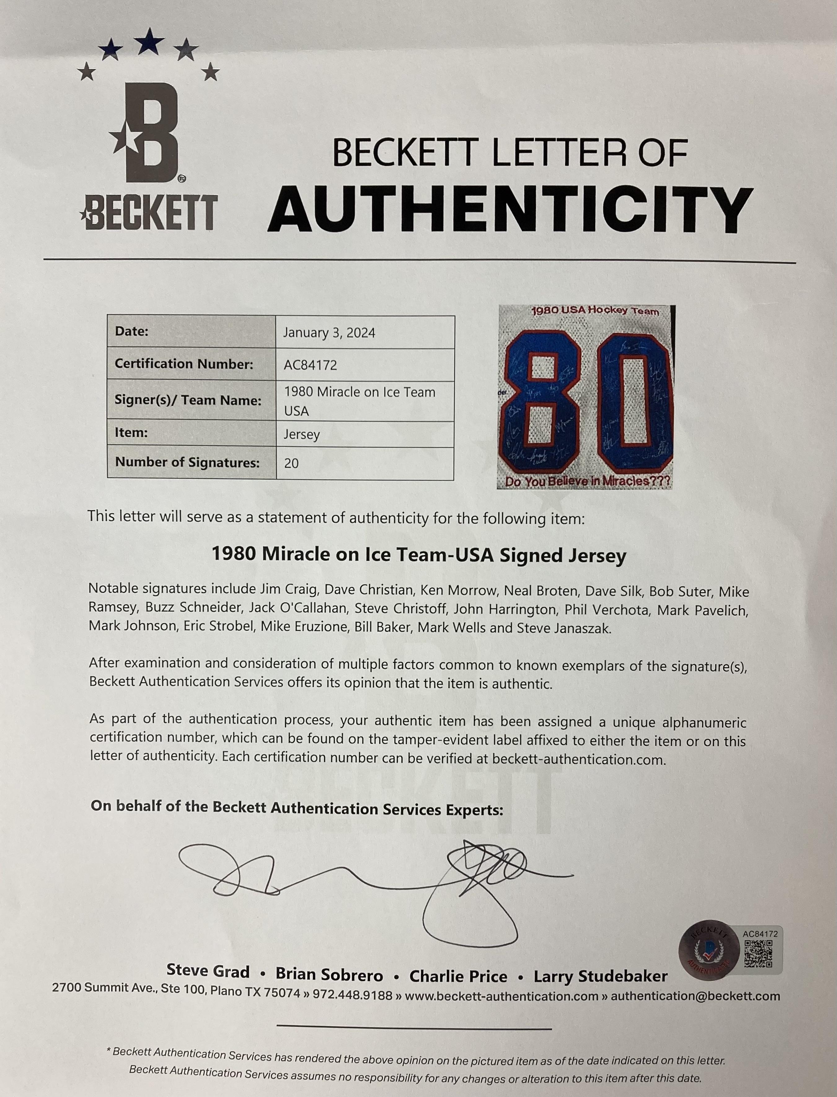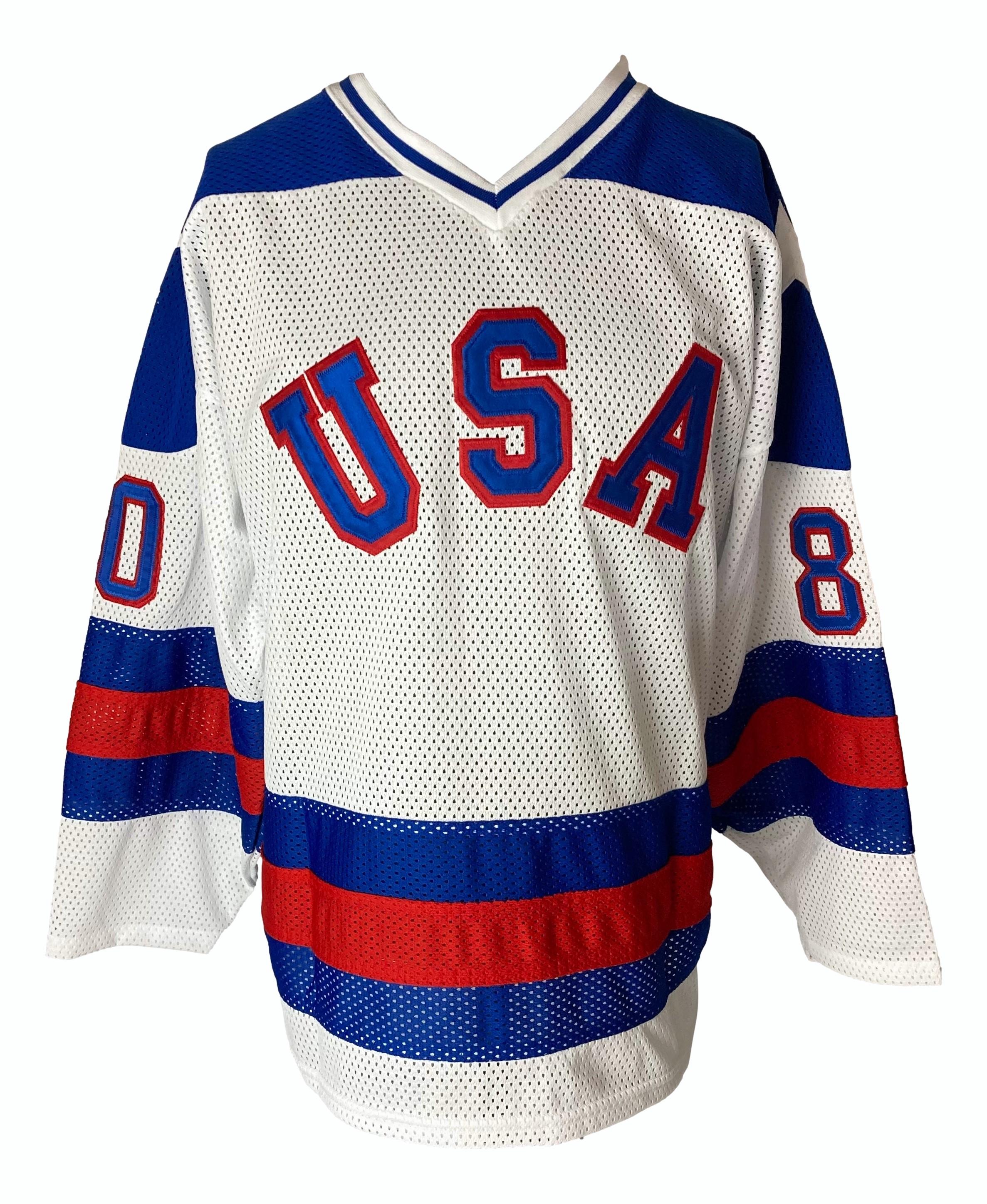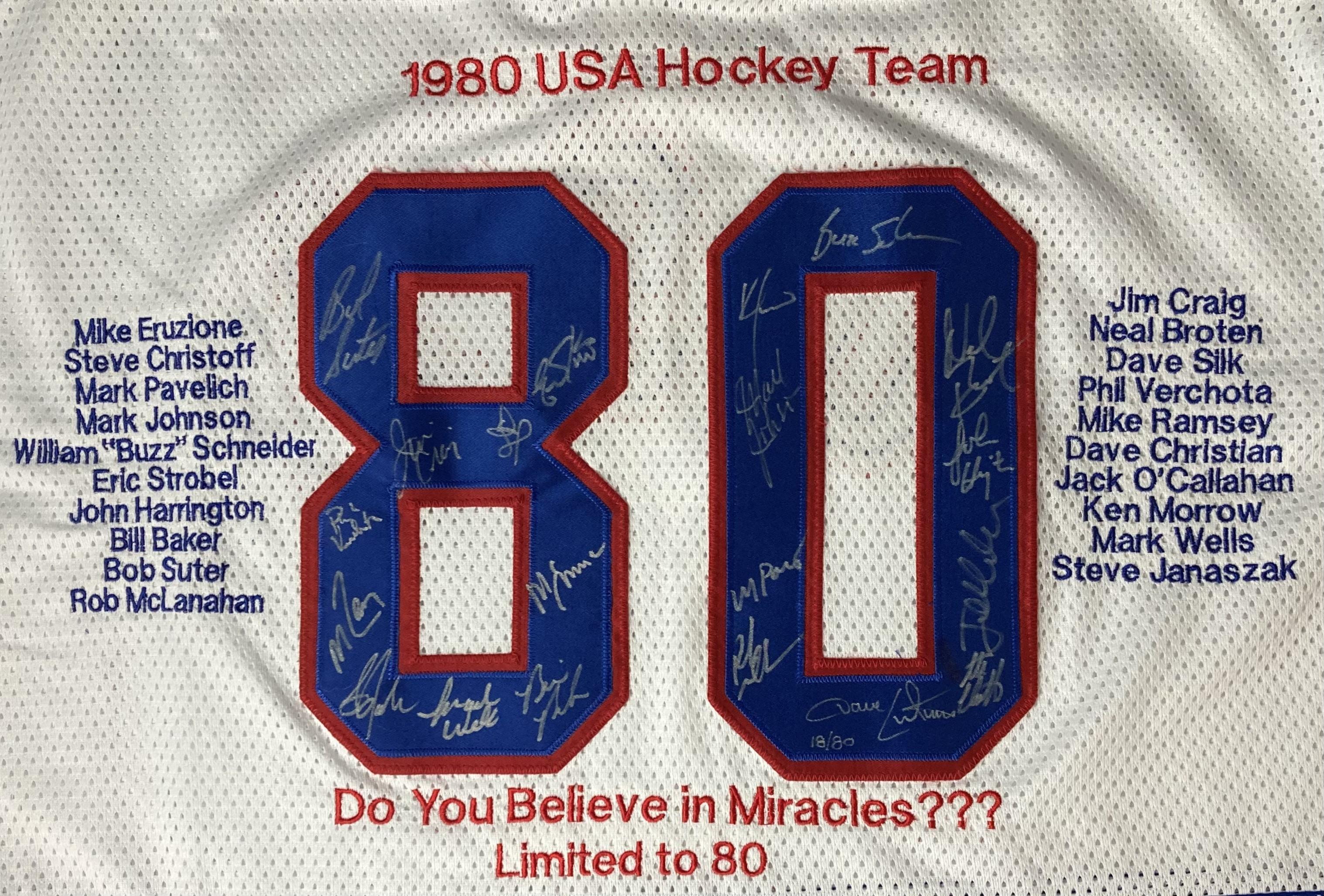 Athletic Knit style jersey with everything sewn on, size XL. Hand-signed by (20) members of the 1980 Team USA hockey team. Signers include Mike Eurzione, Jim Craig, Neal Broten, Steve Christoff, Mark Pavelich, Mark Johnson, Buzz Schneider, Eric Strobel, John Harrington, Bill Baker, Bob Suter, Rob McLanahan, Dave Silk, Phil Verchota, Mike Ramsey, Dave Christian, Jack O'Callahan, Ken Morrow, Mark Wells, and Steve Janaszak.