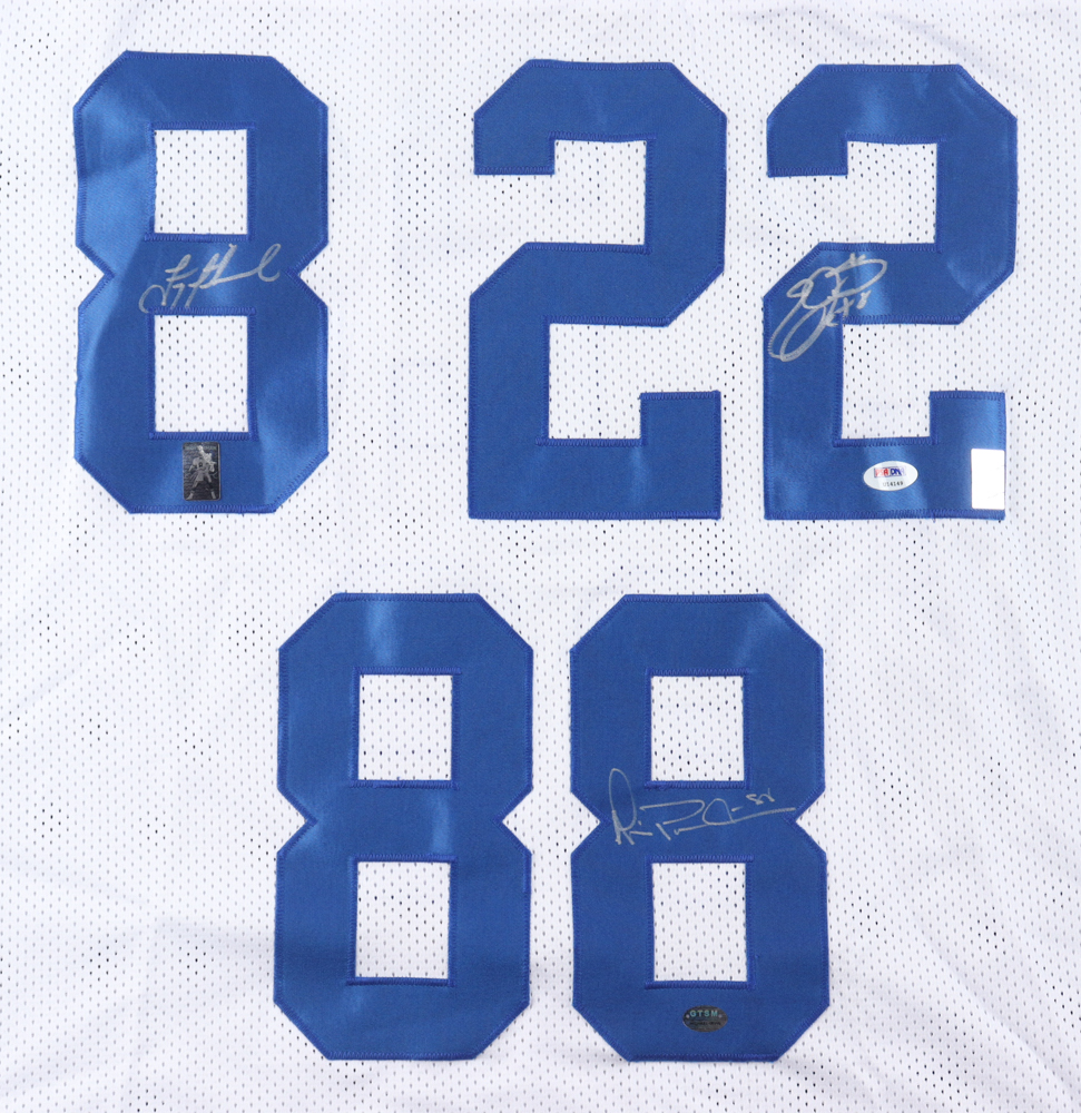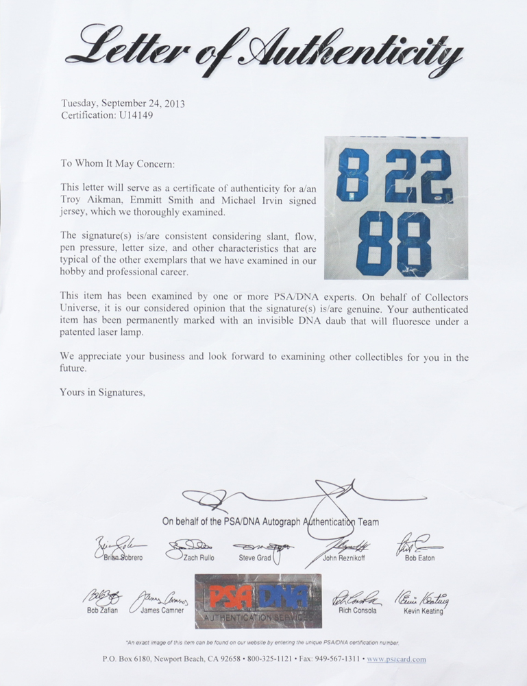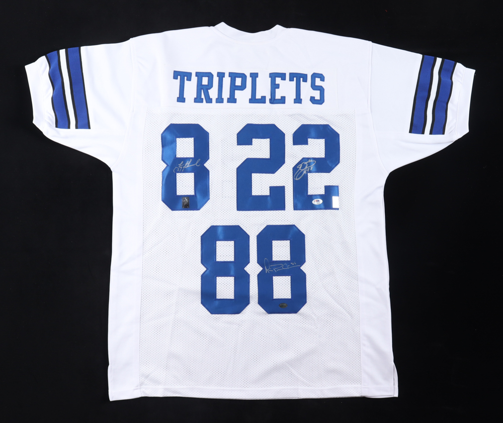 Custom jersey has been hand-signed by Troy Aikman (HOF), Emmitt Smith (HOF), and Michael Irvin (HOF).