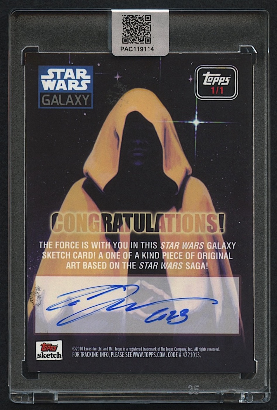 This original sketch card includes original pen/ink/marker art by renowned comic book artist, Tom Hodges. This an officially licensed card by Lucasfilm and released by Topps in 2010. This is an extremely rare 1/1 artist proof card! This is NOT a pack pulled card and was directly owned by the artist.