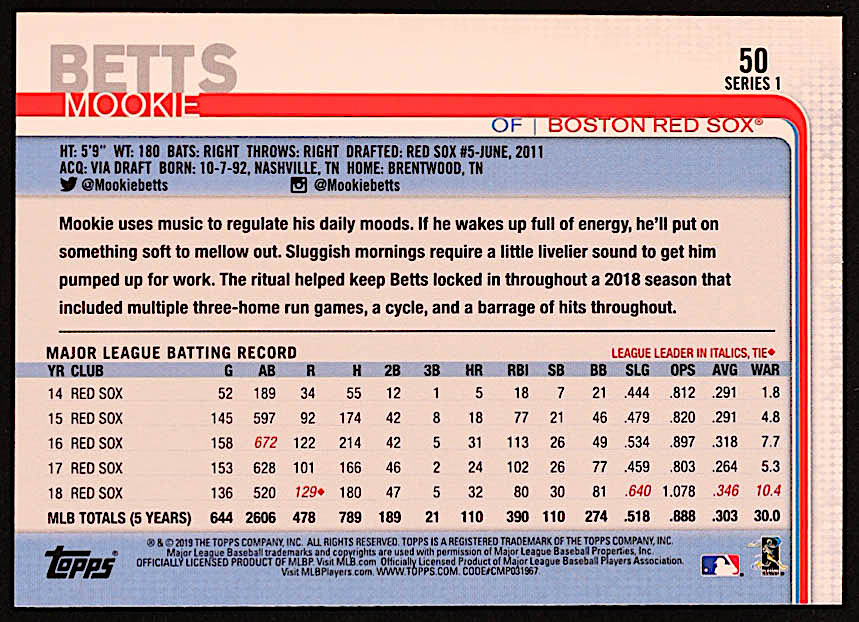 Mookie Betts 2019 Topps Base Set Photo Variations #50 / Crouching
