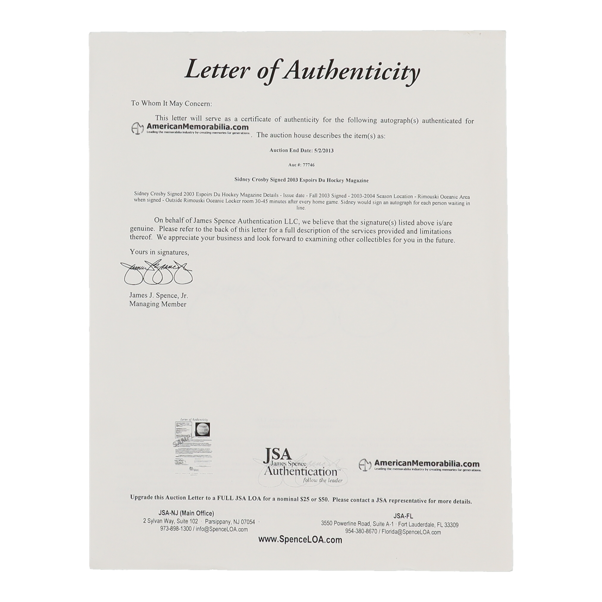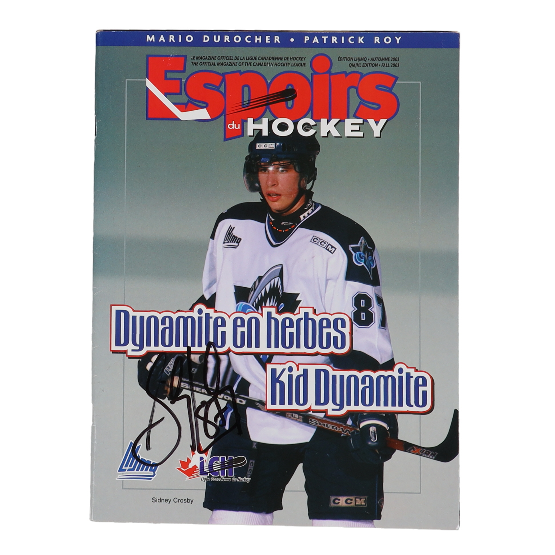 Fall 2003 issue of "Espoirs du Hockey" magazine has been hand-signed on the front cover by Sidney Crosby (Pittsburgh Penguins).