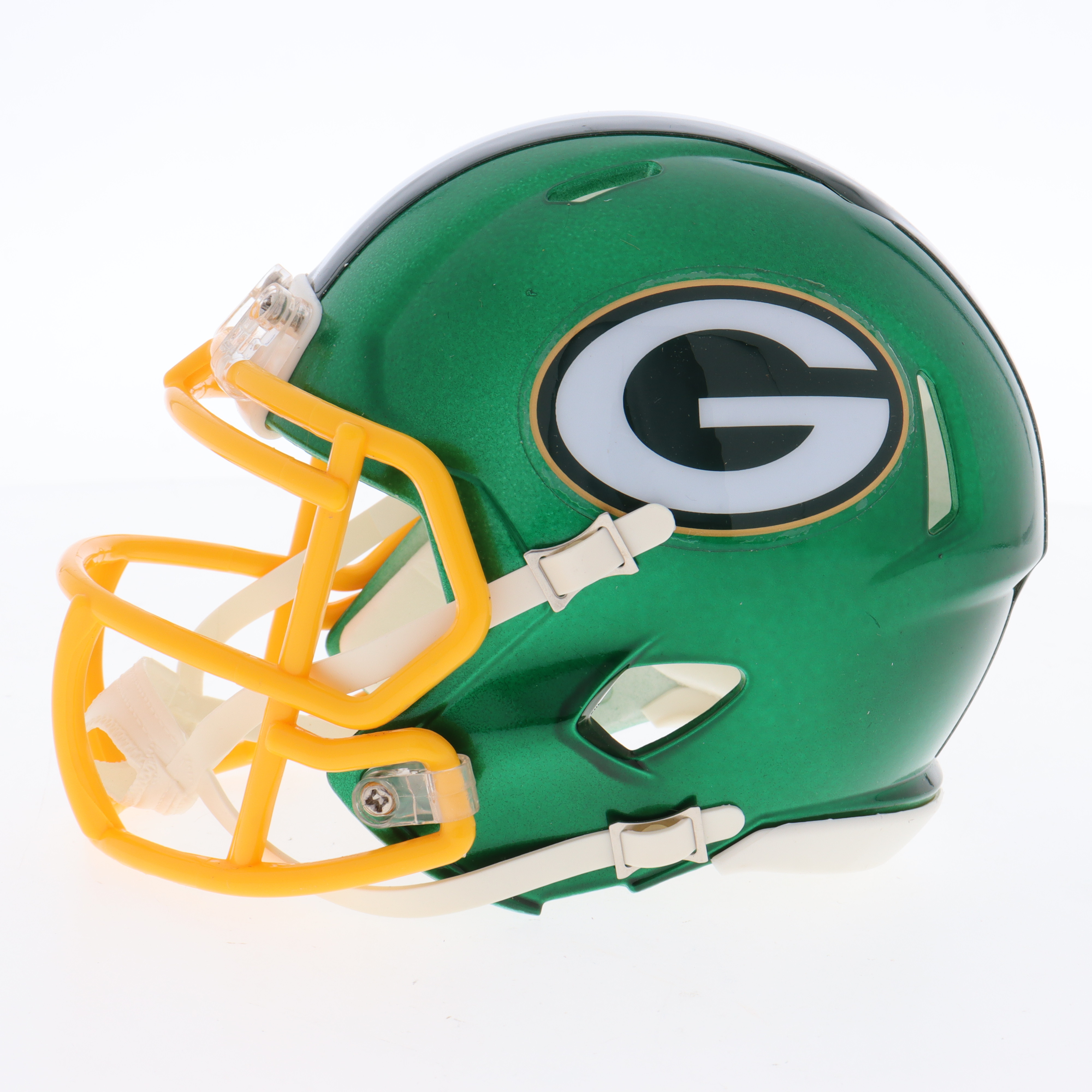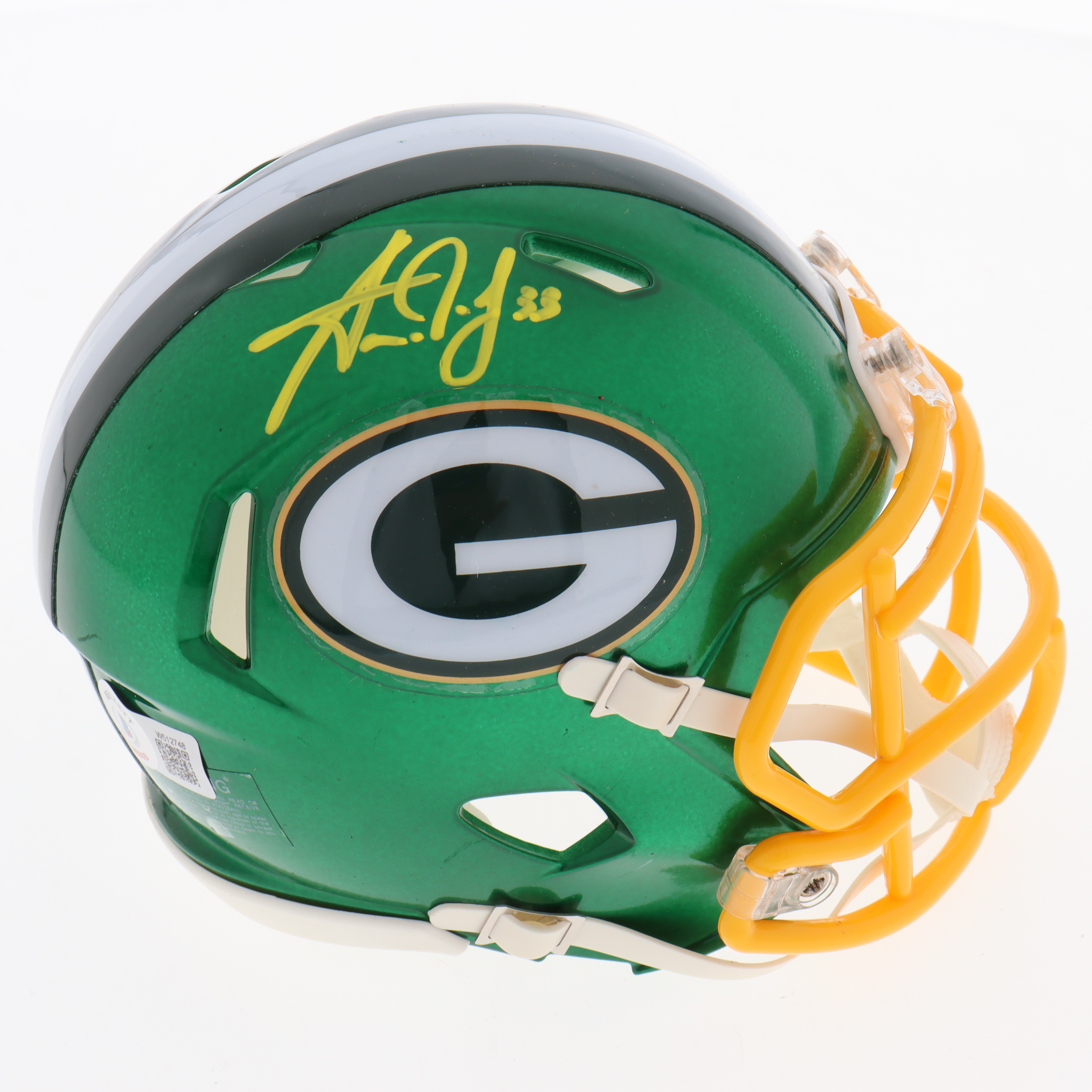 Riddell Green Bay Packers Flash Alternate Speed mini helmet. Hand-signed by Aaron Jones.