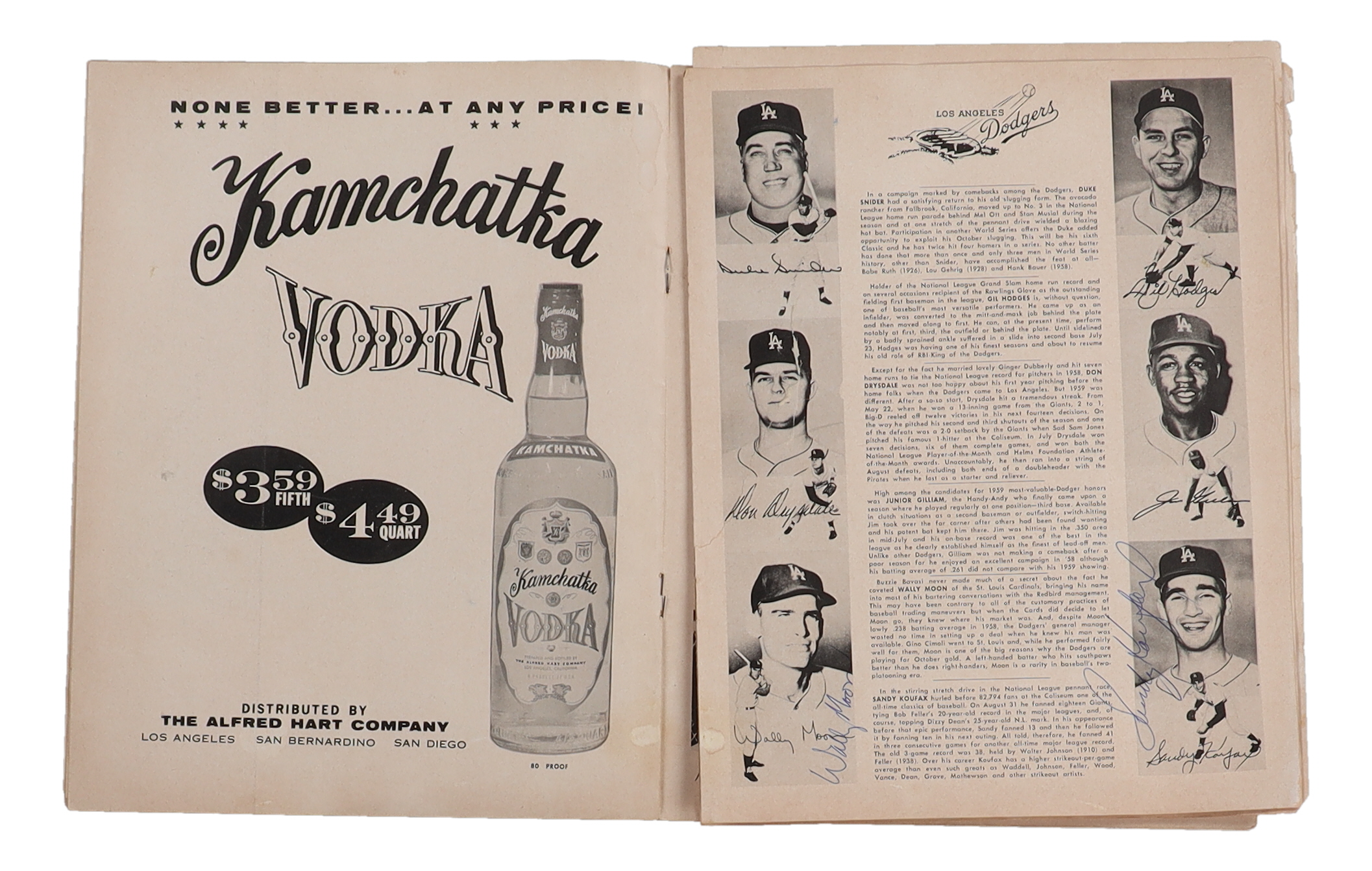 1959 World Series souvenir program has been hand-signed by Sandy Koufax (Los Angeles Dodgers, HOF), Bill Veeck (D. 1986, Chicago White Sox, HOF), Wally Moon (D. 2018, Los Angeles Dodgers), and Don Demeter (D. 2021, Los Angeles Dodgers).